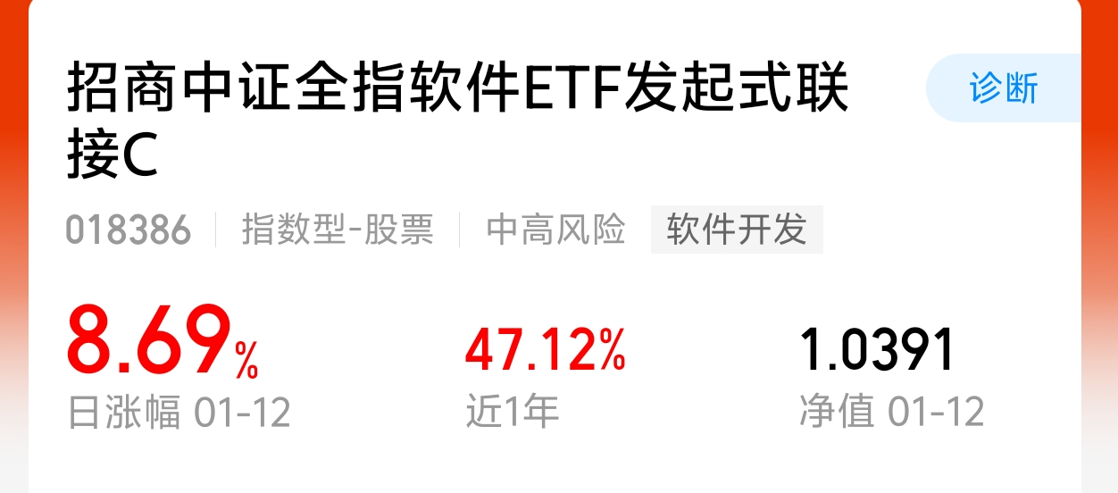 $招商中证全指软件ETF发起式联接C$ 昨日招商中证全指软件大涨8.69%,表现非常优秀,流星还是比较看好新兴起的GEO板块,主要聚焦游戏传媒,春节前有利好预期,目前可以分批布局,行情向好,干就完了