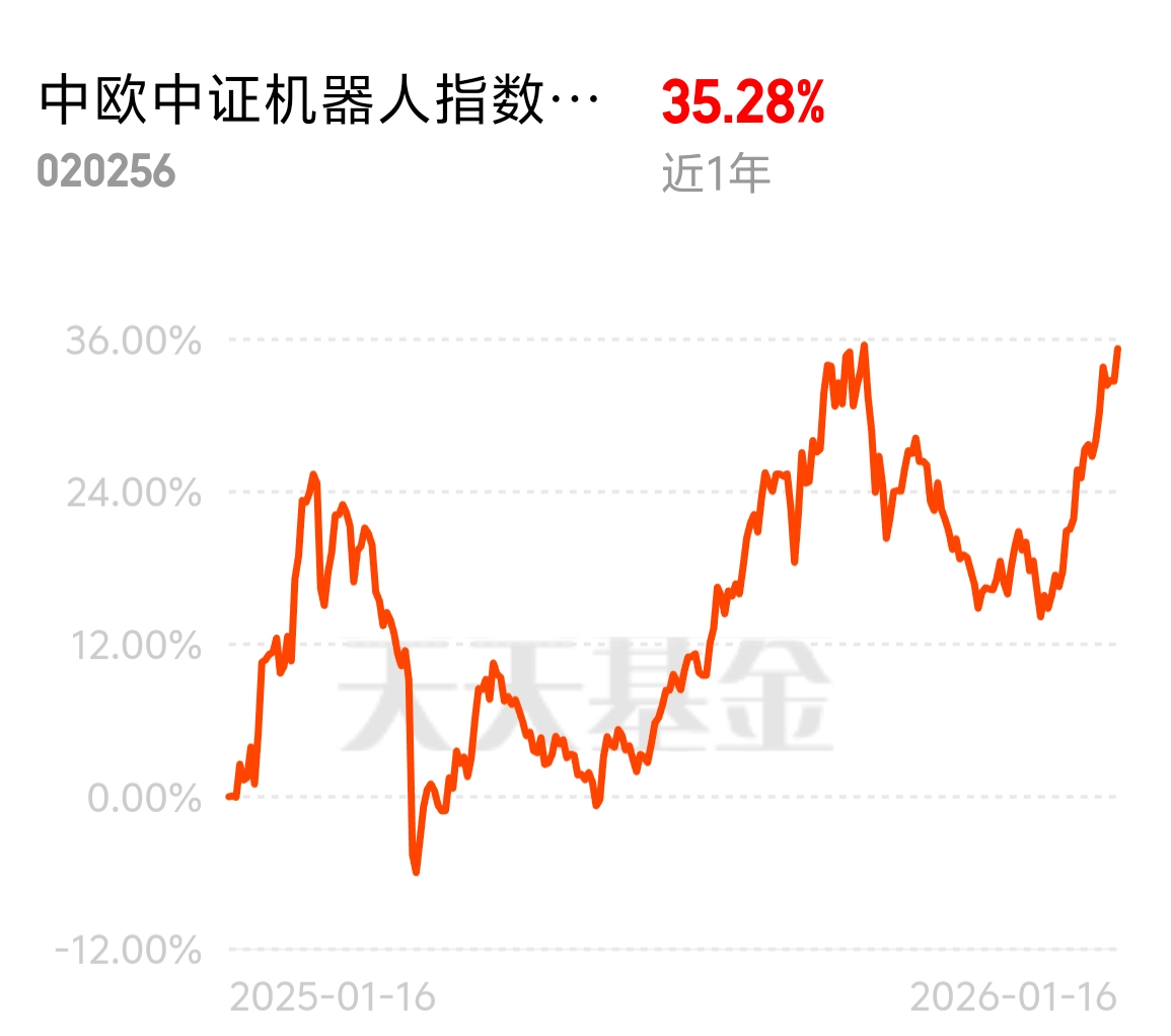 八部门刚发了 “人工智能 + 制造” 专项文件,人形机器人要建中试基地和标杆产线,行业迎来政策强支撑。中欧中证机器人指数发起 C 复制对应指数,重仓工业自动化、AI 等龙头,近 1 年涨 35.28%,现在板块成交额占比处低位,比追高靠谱多了,值得布局。$中欧中证机器人指数发起C$