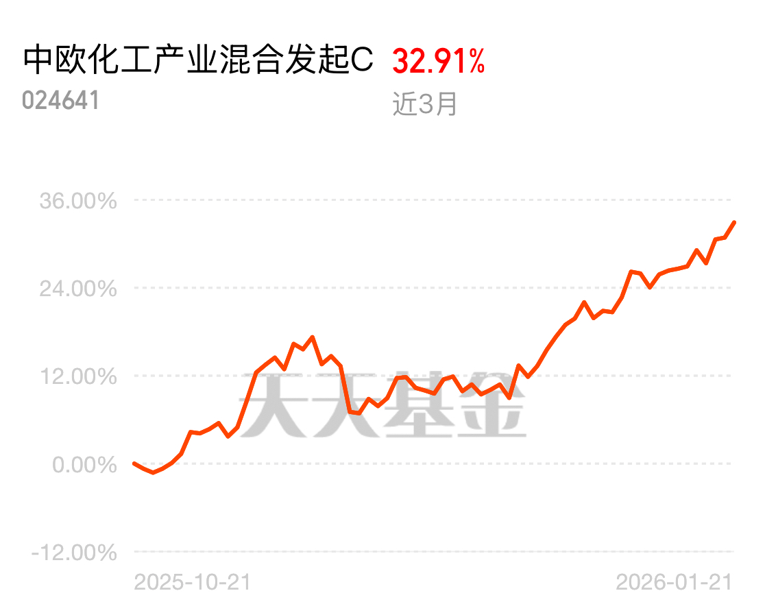 现在化工板块迎来 PPI 触底反弹的关键节点,供需关系持续优化,周期反转信号超明显,顺周期大爆发!从上游有色发展到中游化工,持续延续高景气,化工产业近期涨幅稳健领先,中欧化工产业混合发起 C 近 3 月拿下 32.91%,妥妥踩中化工风口$中欧化工产业混合发起C$
