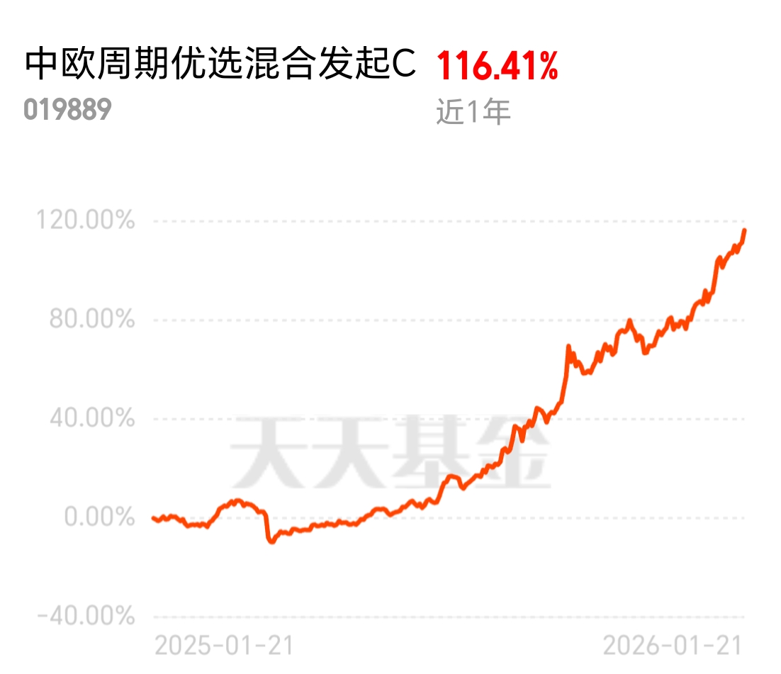 盯盘发现市场大动作,1 月 21 日国际金价迎来突破性上涨,现货黄金站上 4840 美元 / 盎司新高,日内涨近 2%,有色金属延续高景气今回调,中欧周期优选混合发起 C 近 1 年 116.41%,这会儿入场超划算