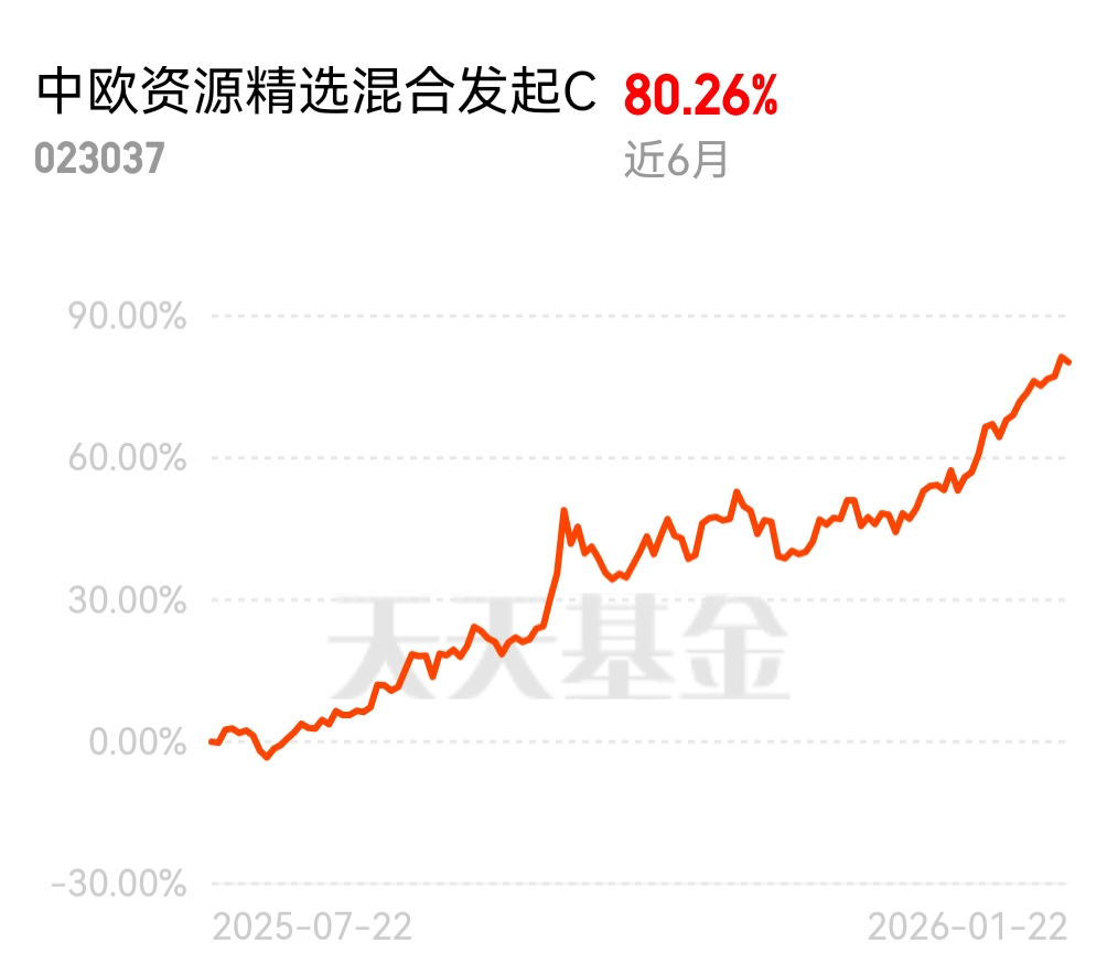 1 月 22 日现货金价破了 4900 美元大关,地缘风险叠上多国央行购金潮,美联储政策转向的预期、美元信用危机和避险需求一起发力,机构看金价冲 5000,有色金属高景气没断,今天倒车接人,中欧资源精选混合发起 C 近 6 月 80.26%,这会儿入场正合适$中欧资源精选混合发起C$