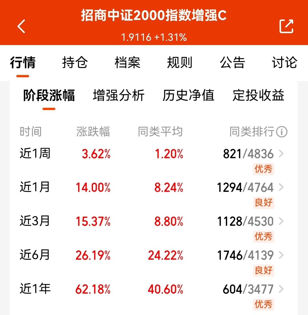 我还是比较看好这支$招商中证2000指数增强C$ ,跟踪中证2000指数,半导体、商业航天、机器人等各大热门科技雨露均沾,而且盘子小,反弹快,近1个月涨了14%,近1年收益也有62.18%了,反倒是跑赢沪深300等大盘指数,长期赚钱效应依然不错了,我是看好接下来修复的!