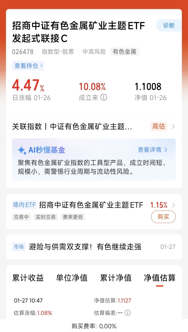 $招商中证有色金属矿业主题ETF发起式联接C$ 这只聚焦有色金属矿业主题的指数基金。全面覆盖有色金属上游矿产产业链。昨天上涨了4.47%。爆发力的表现好。随着金价的上涨,持续推动了矿业的盈利预期增长,而且全球矿业整合还在加速,所以有色金属矿业的成长空间我是长期看好的。