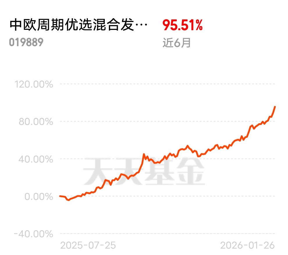 手里拿着中欧周期优选混合发起 C 太香了,近 6 月涨了 95.51%,当下市场轮动没规律,科技热度虽没减可估值高得不敢碰,追高容易踩坑,有色板块却一路向上,高景气还在延续,选对基少走弯路