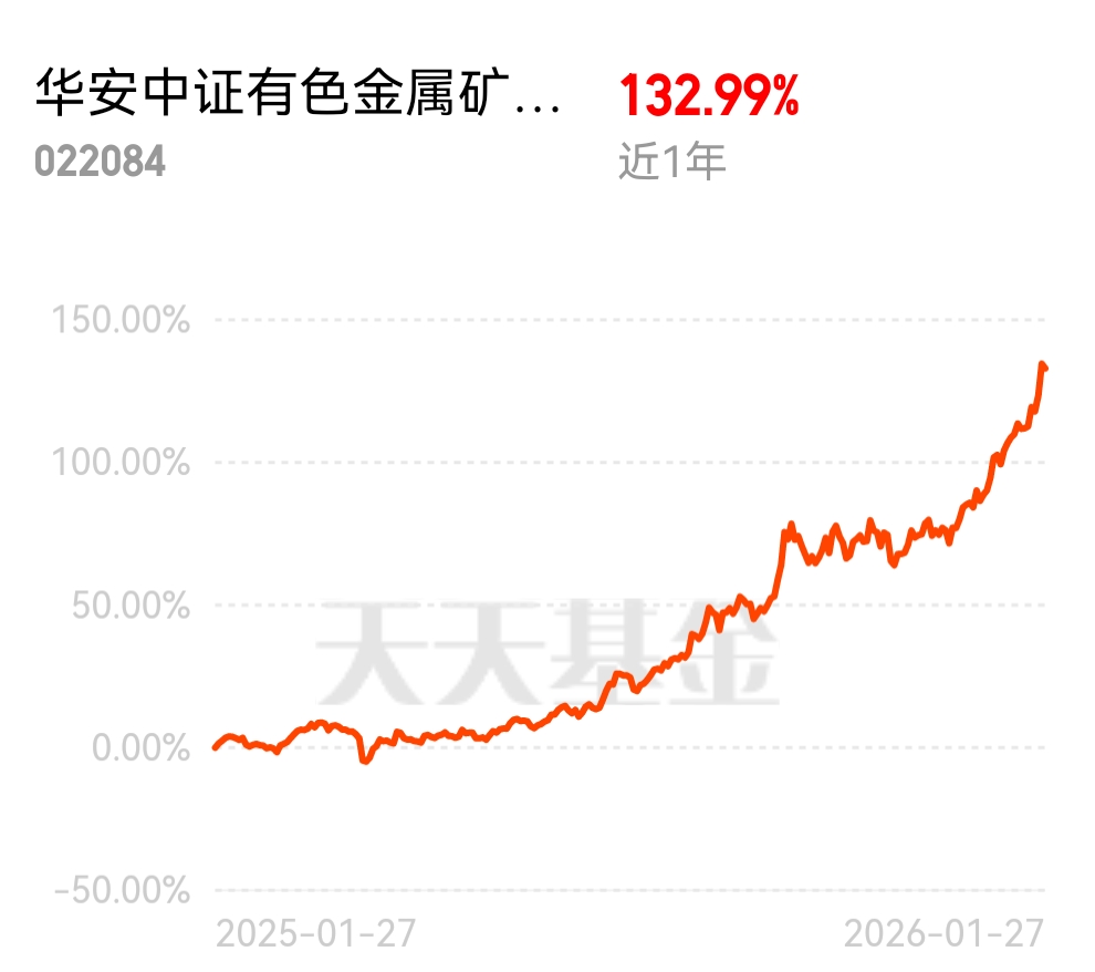 华安中证有色金属矿业主题指数 C,100% 纯有色成分股,近 1 年涨 132.99%,今年收益也领先,拿着超给力