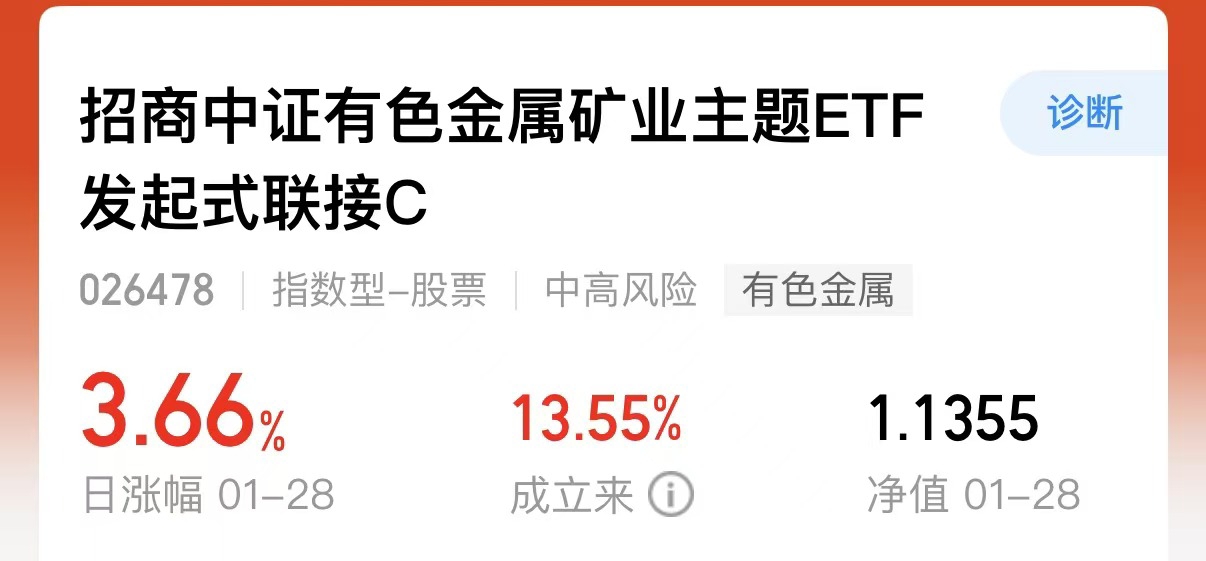 今天黄金和有色又创下了新高。黄金都突破5500了,这波在车上的真是赢麻了,我前天上车的有色也错$招商中证有色金属矿业主题ETF发起式联接C$ 昨天上涨3.66%。聚焦有色金属赛道,这只基金未来的潜力还是很大的。