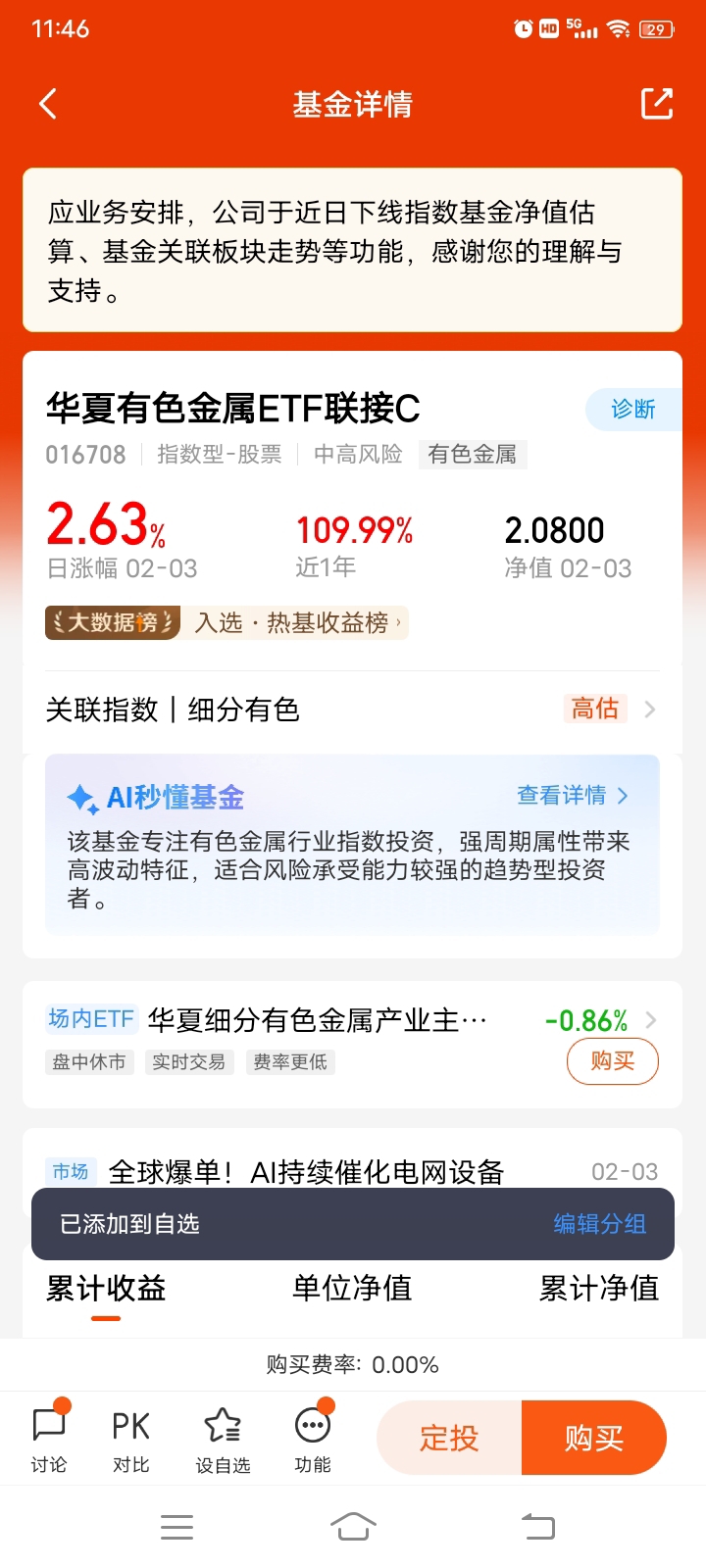 再说说华夏有色金属ETF联接C这只基金。它跟踪的是细分有色指数,能精准捕捉行业内的优质标的,近1年收益率达到了109.99%,表现非常亮眼。而且它是ETF联接C,申购费为0,持有超过7天还免赎回费,对定投来说成本优势很明显。