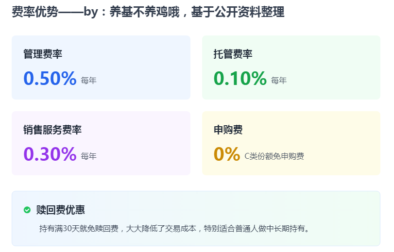 最戳我的一点,是这只基金的费率非常低,投资成本亲民,特别适合普通投资者长期布局,不用承担过高的费用压力。对我来说,投资基金的资金大多不算充裕,费率的高低直接影响着最终的收益,过高的费率会无形中侵蚀我们的收益,尤其是在长期定投的情况下,费率的影响会更加明显。这只基金属于C类份额,最大的优势就是免申购费,而且持有满30天之后,赎回费也为0,没有额外的费用负担。除此之外,它每年的管理费率只有0.50%,托管费率0.10%,销售服务费率0.30%,三项费率加起来每年也才0.90%,比很多同类指数基金的费率都要低。
