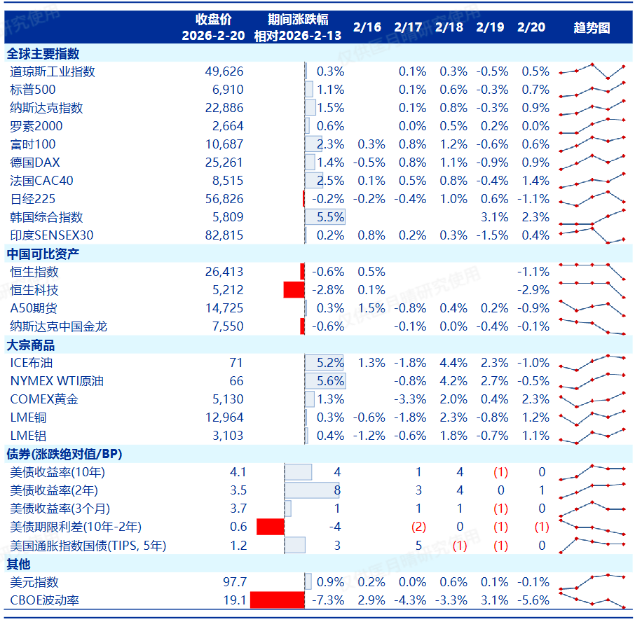 2月16-20日春节期间,全球重要股指多数上涨,投资者对AI颠覆性影响的担忧缓和、欧股财报强劲、以及美国最高法院裁决关税无效,推动市场风险偏好总体回升。AI产业链叙事助推韩国KOSPI领涨,涨幅达5.5%。欧股表现次之,法国CAC40、英国富时100、意大利富时、德国DAX指数,分别上涨2.5%、2.3%、2.3%、1.4%,主要受财报强劲的带动,部分投资者削减美股持仓,转向增配欧洲股市。纳斯达克和标普500分别上涨1.5%和1.1%,涨幅相对温和。美联储降息预期回撤,以及美伊局势扰动,使得美股相对跑输欧股。