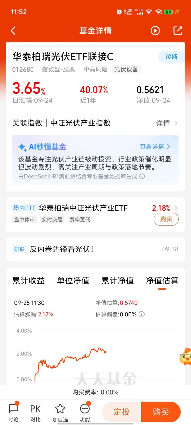 今天光伏行情不错,华泰柏瑞光伏基金上午估算涨了2.12%。近期它的表现很能打,昨天涨3.65%,近1年涨了40.07%。要是你看好光伏行业,这基金可以考虑,跟着它在光伏领域赚钱机会挺大。#“924行情”一周年 你赚了多少?#