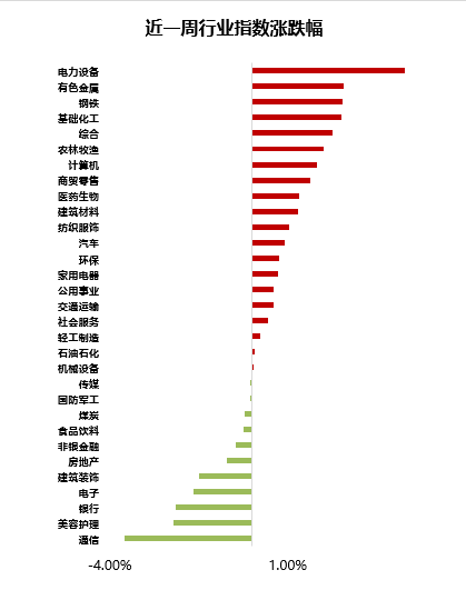 l 过去一周(2025.10.27-2025.10.31),主要宽基指数多数上涨。上证指数上涨0.11%,创业板指上涨0.50%,沪深300下跌0.43%,中证500上涨1.00%,中证1000上涨1.18%,科创50下跌3.19%。风格上,主要风格指数多数上涨,其中周期(+1.21%)风格领涨。从申万一级行业看,上周行业涨跌互现,其中领涨的行业有电力设备(+4.29%)、有色金属(+2.56%)、钢铁(+2.55%),跌幅靠前的行业有通信(-3.59%)、美容护理(-2.21%)、银行(-2.16%)。(数据来源:iFind)