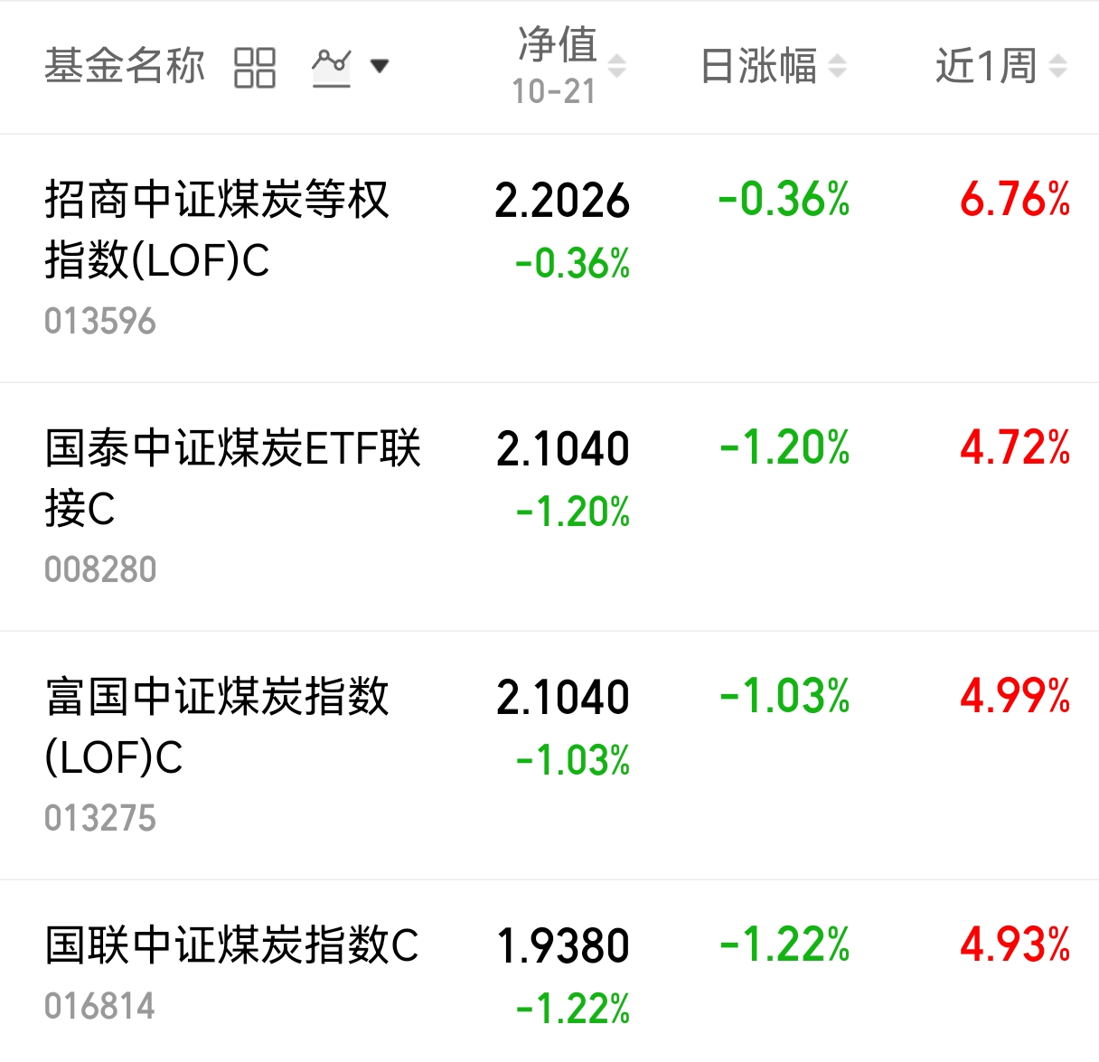 $招商中证煤炭等权指数(LOF)C(OTCFUND|013596)$跌幅0.36%$