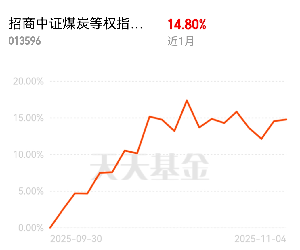 开盘后煤炭板块就保持上涨节奏,早盘没怎么波动,很稳健。招商中证煤炭等权指数C精准跟踪,近1个月14.98%的收益到手了。