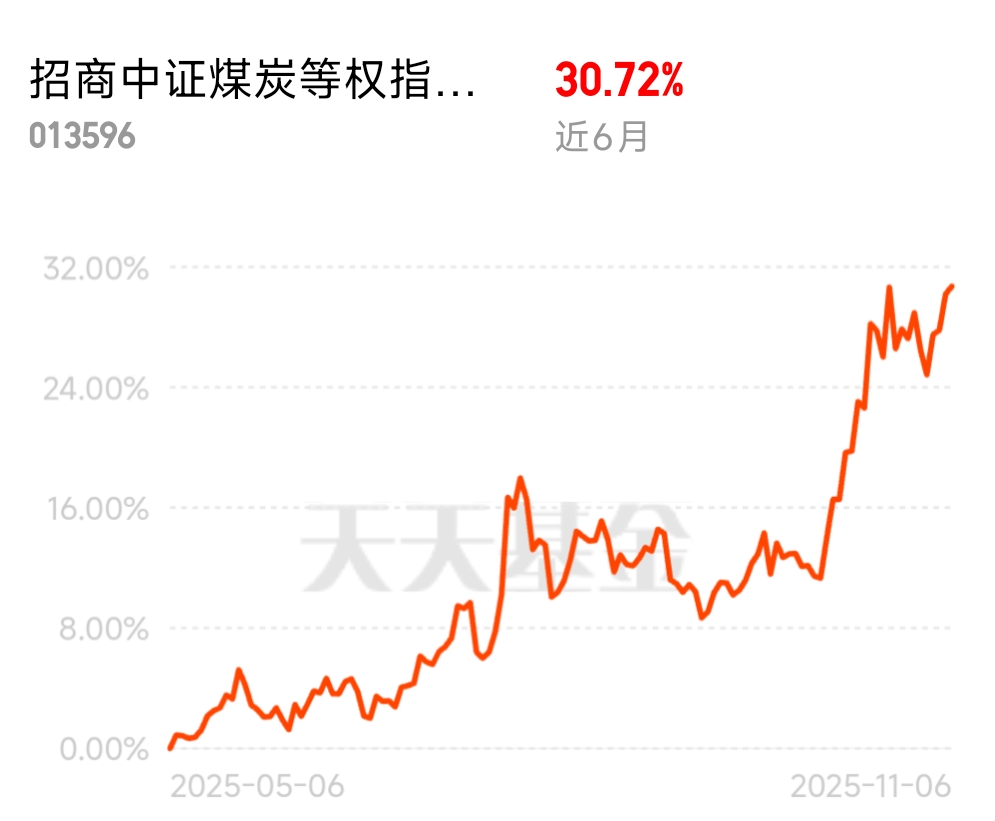 部分煤矿因为安全检查或检修减产,短期供给跟不上,而终端补库需求又很旺盛,煤价持续走强。招商中证煤炭等权指数C近6个月涨30.72%,昨日涨幅0.40%,煤炭赛道景气度高,想参与的可以关注这款产品。