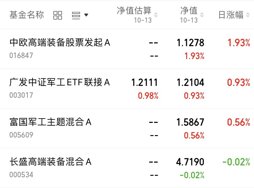 今天表现比较亮眼的板块是有色和半导体设备,军工板块表现窄幅收红,但我惊喜的发现$中欧高端装备股票发起A(OTCFUND|016847)$竟然上涨1.93%,完全跑赢了板块!上涨0.93%,上涨0.56%,下跌0.02%。