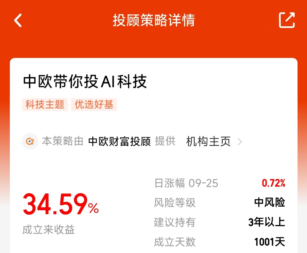 科技产业趋势长期向好,但短期波动难免。比如AI技术从研发到商业化需要时间,期间市场情绪可能反复。投顾组合的防御性配置能帮助投资者平稳过渡。像“中欧带你投AI科技”在科技行情不明朗时,会增加宽基指数比例,降低整体波动;一旦趋势明朗,再提升科技仓位。这种灵活的策略使组合在近一年最大回撤控制在24%左右,而收益超过91%。如果你认同科技是未来主线,但担心持有过程颠簸,可以考虑这种有风险控制机制的产品。#创业板指创阶段新高 致敬“924行情”#