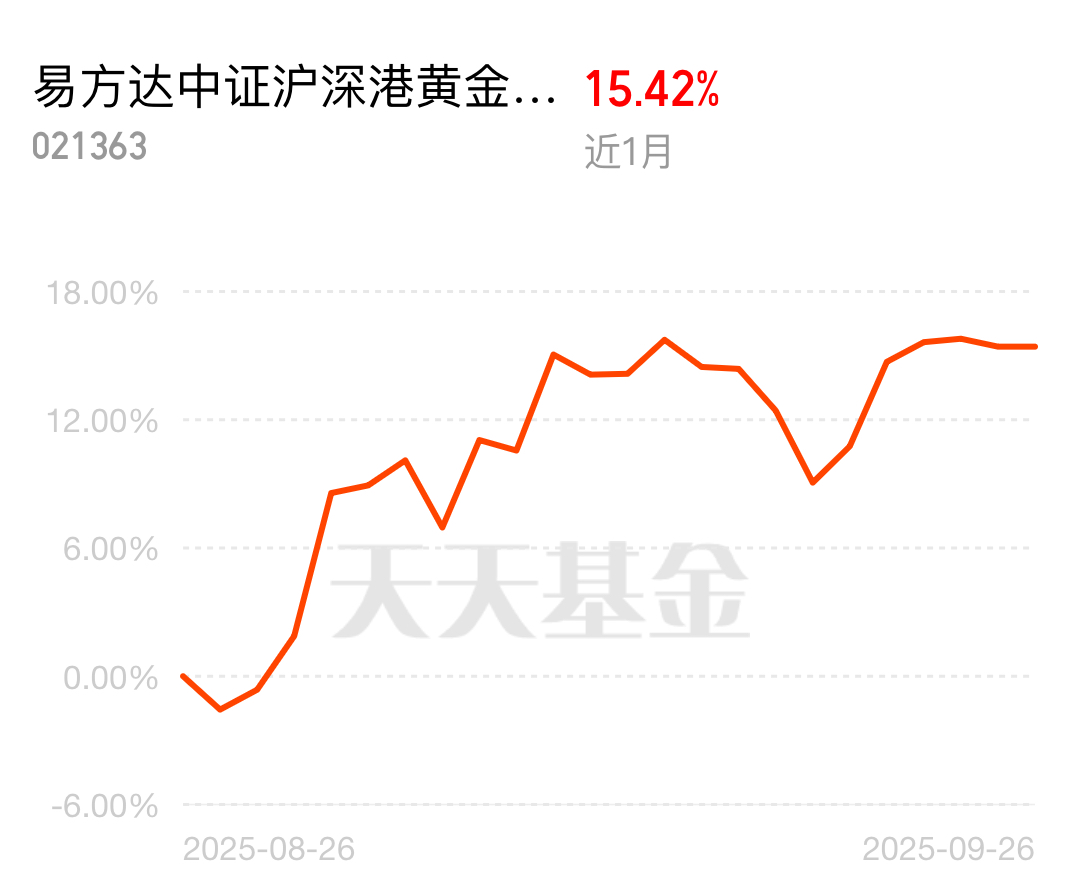 $易方达中证沪深港黄金产业股票指数发起式C$ 最近避险情绪浓,黄金价格一路往上冲,产业板块的股票也跟着涨。易方达中证沪深港黄金产业股票指数C近1个月15.42%,上车跟上步伐!