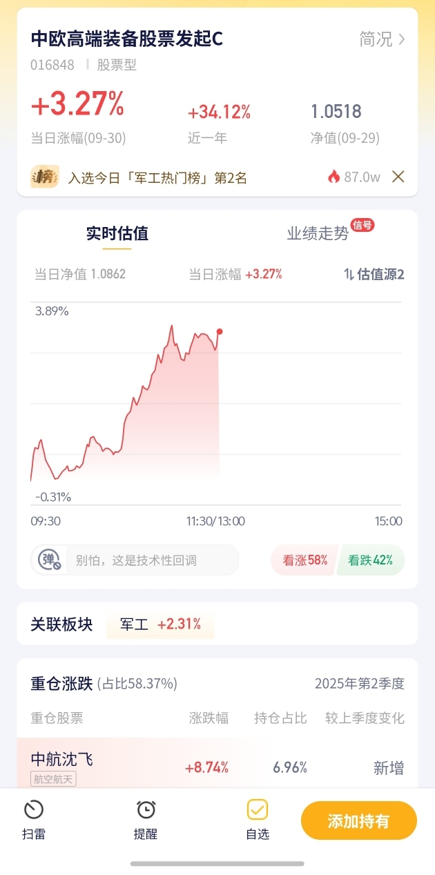 3. 中欧高端装备股票发起C:昨天跌了0.6%,今天直接反弹3.27%,军工板块这波反弹真猛,拿住的朋友今天都回血了。