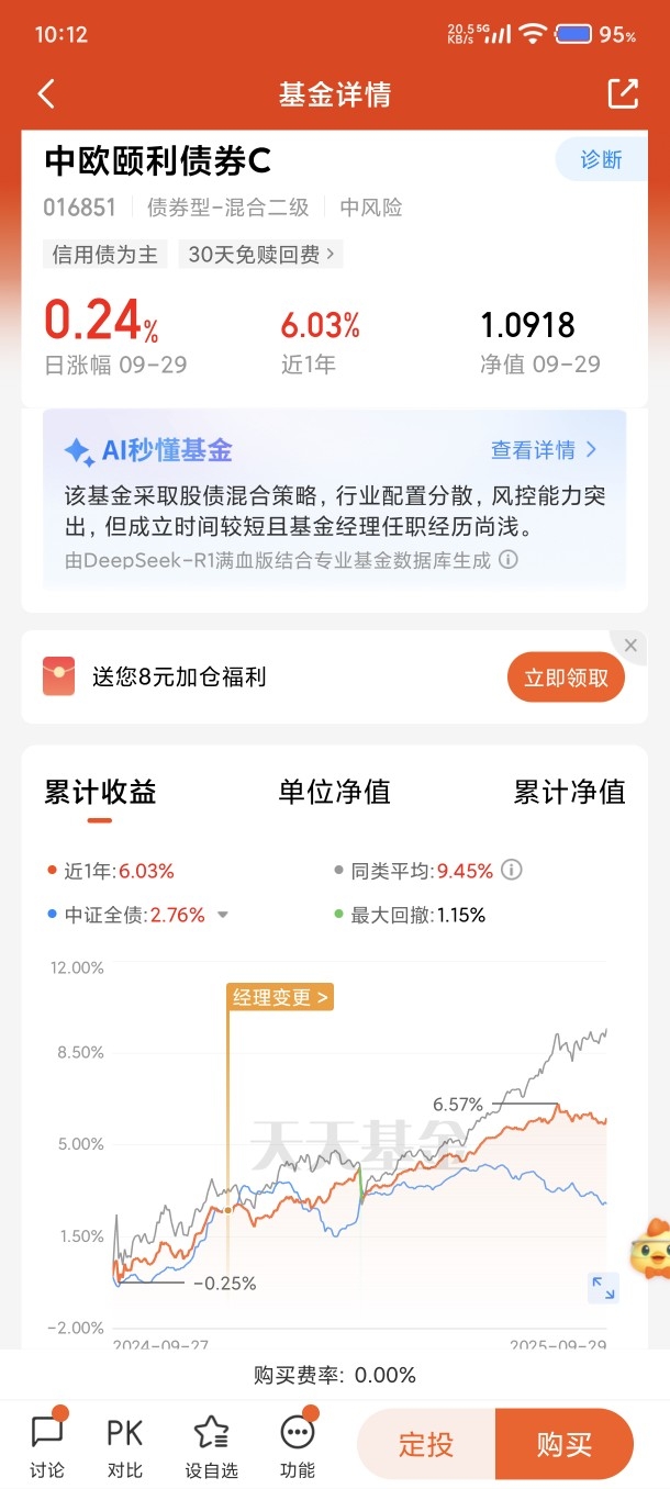 基金约9.14% 的资产投资于股票市场,行业配置相对分散,涉及制造业、公用事业、环保等行业,旨在增强收益 。中欧基金作为国内知名的基金公司之一,整体背景和实力雄厚。我准备将这只基金加入自选,纳入长期观察之中,感兴趣的同学可以择机关注布局!