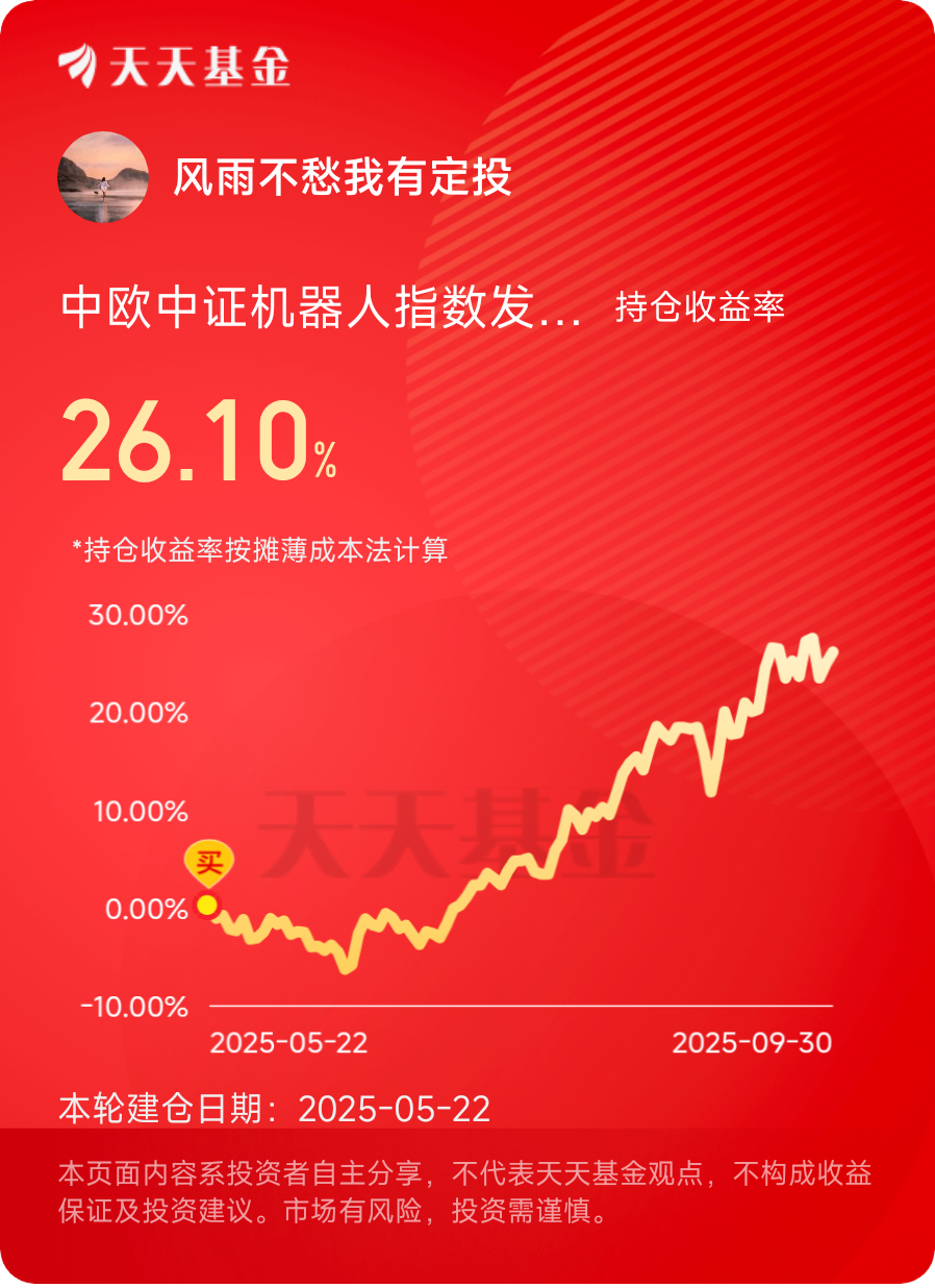 #股债平衡:投资中的攻守道# 我常年保持着健身的习惯,特别钟爱团队运动。在球场上,既要抓住进攻机会,又要做好防守准备,这种思维方式不知不觉就融入了我的投资理念。我的投资组合构建得很简单:用中欧机器人指数来进攻,这个指数投资的是领先的机器人和自动化公司,代表着未来的成长方向;用中欧纯债来防守,依靠其稳健的债券投资来平滑组合波动。这样的配置让我的投资既有向上的弹性,又有向下的保护。选择这两个工具,是因为它们各自的特点非常鲜明:机器人指数充满活力,有望带来超额回报;纯债基金踏实稳重,能够提供持续稳定的收益。在实际操作中,我不会因为市场的一时涨跌就轻易改变这个基本配置,而是会坚持既定的投资纪律。就像在运动场上,既要有得分的激情,也要有防守的耐心,投资同样需要在进取和稳健之间找到属于自己的平衡点。