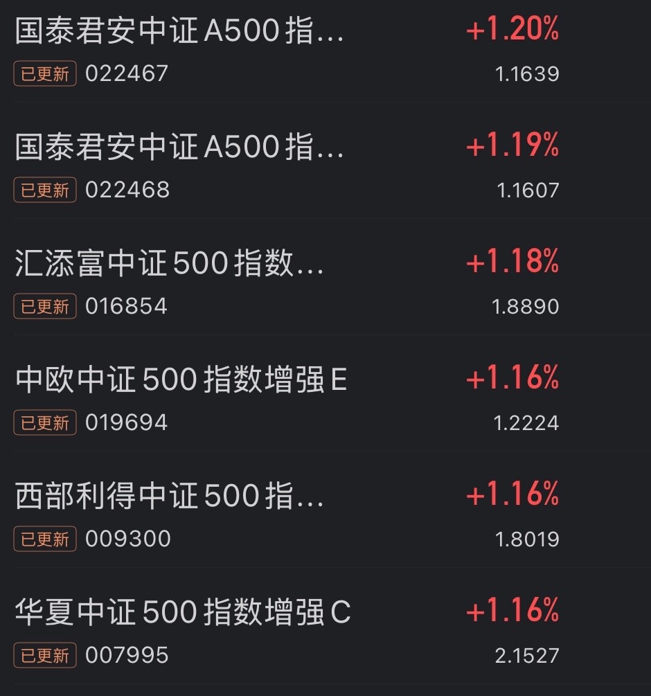 $国泰君安中证A500指数增强A$ 上涨1.2%$中欧中证500指数增强E$ 上涨1.16%$西部利得中证500指数增强(LOF)C$ 上涨1.16%