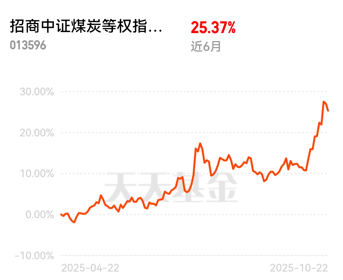 最近煤炭行情挺亮眼,供给端反内卷政策卡得严,货少了,加上冷冬要到消耗涨,煤价跟着往上走。现在中证煤炭等权指数涨3.98,另一指数涨2.1,招商中证煤炭等权指数C近6个月涨25.37%,抓机会挺合适。 $招商中证煤炭等权指数(LOF)C$