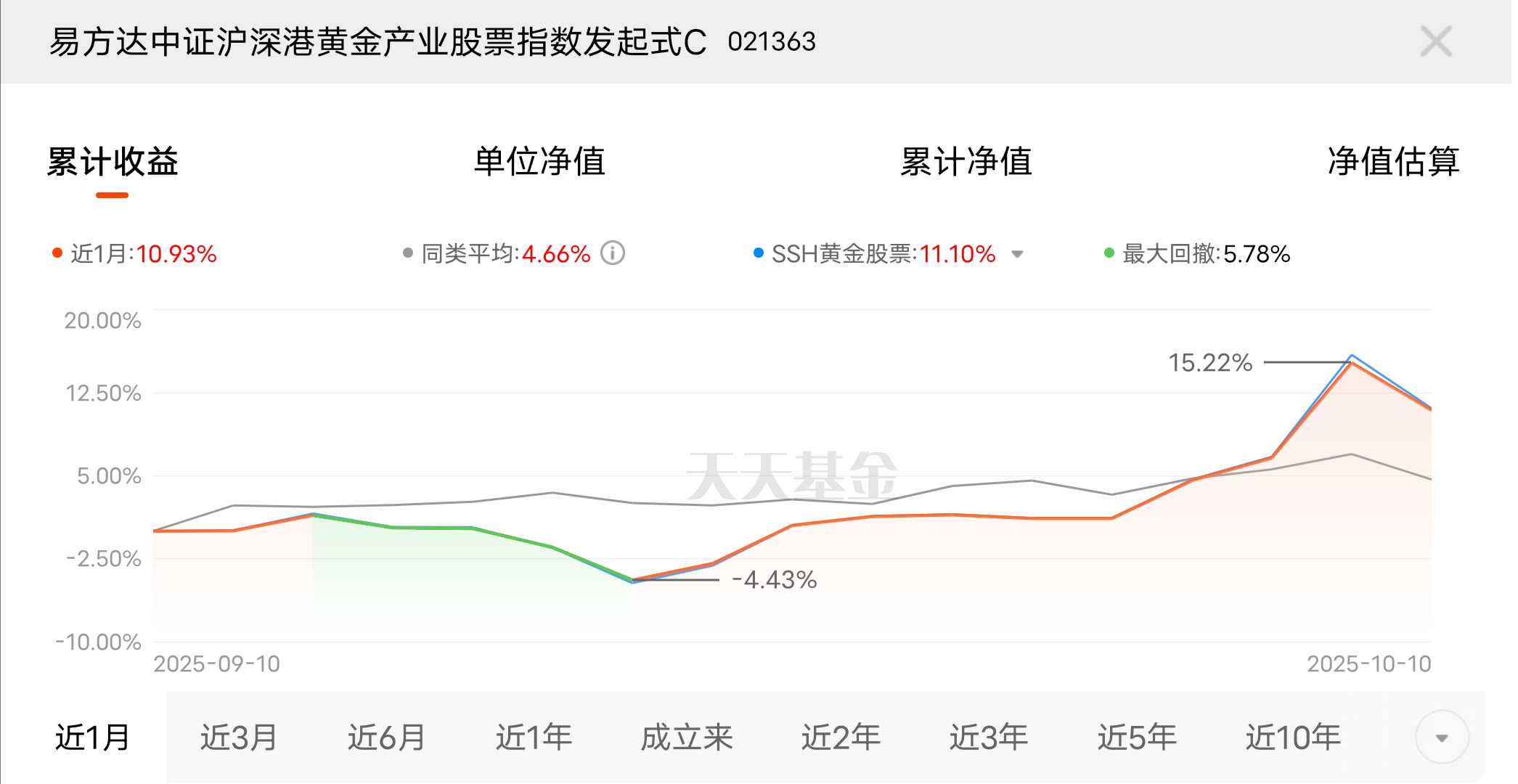 最近黄金回调了下,但支撑位很稳,算是给上车机会,行情后续看涨。易方达中证沪深港黄金产业股票指数C近1个月10.93%,赶紧动手,别错过。
