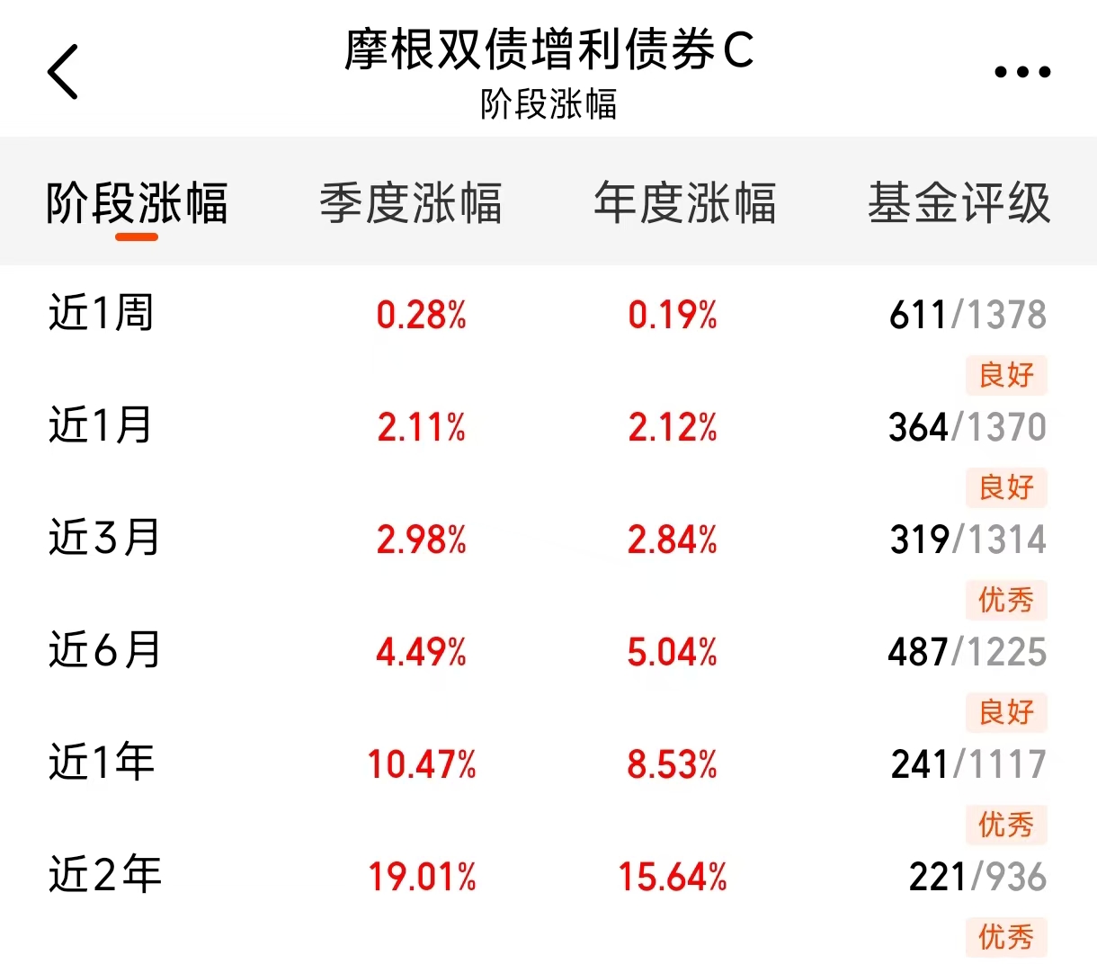 今天是不是又觉得投资像在拆盲盒?其实2026年这种行情里,最宝贵的不是赚多少,而是少亏多少。现在市场为什么这么撕裂?低利率环境下纯储蓄购买力缩水,而"固收+"产品通过配置权益资产增强收益弹性,正好能应对这种环境。股市虽然有望慢牛但结构分化,债市收益空间有限,这种股债市场特点让"固收+"的股债搭配策略有了发挥空间,而且可转债市场估值过高的情况今年有望缓解,配置价值逐步显现,这种多资产增强收益的策略特别适合稳健投资者。我长期观察的$摩根双债增利债券C$(000378)就很有代表性,10%的股票仓位配债券和可转债,形成三重收益来源,市场好时跟着喝汤,不好时债券部分保底。跟南方宝元债券A(202101)对比一下就很明显了,人家近一年最大回撤-2.89%,$摩根双债增利债券C$(000378)近一年最大回撤-1.74%虽然不算完美,但结合10.81%的收益来看,性价比还是不错的,而且这基金两天就涨了0.5%。这基金最让我踏实的是它的"用户画像"——90%都是专业投资者,这些人都是一分钱亏损失都要开复盘会的主儿,能让他们集体认可说明风控确实严格。现在这种市场,想安心赚钱的朋友真该关注$摩根双债增利债券C$(000378),它就像投资里的安全绳——不保证你飞最高,但保证不摔最惨。#2025超额关键词#