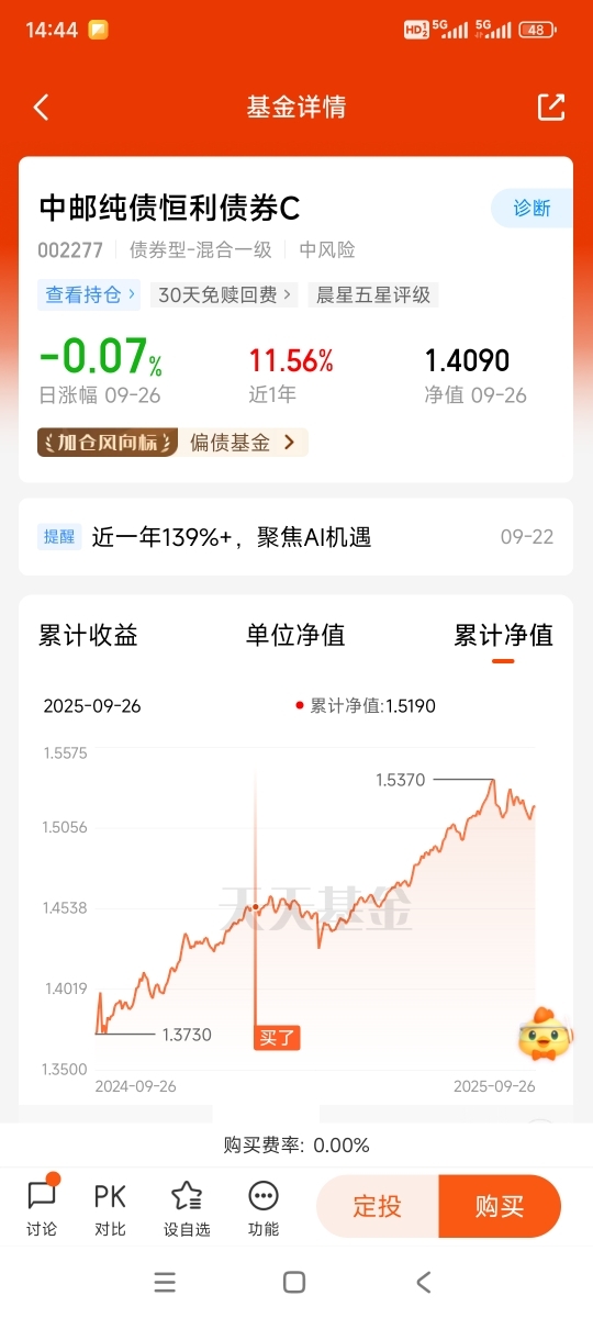 近三月收获200多枚蛋、业绩排名优秀的$中邮纯债恒利债券C$ ,只投可转债和纯债波动小,刚好适配想从纯债切混债的需求,0.3%管理费还特低。