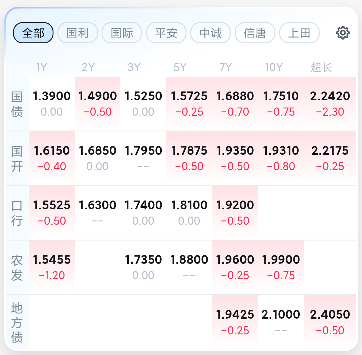 今日央妈大额净回笼,但资金面维持宽松;隔壁权益市场三大指数集体低开后上行叠加小作文所说基金免赎回费周期从6个月降至1个月,债市小幅修复,银行间主要利率债收益率开盘多数下行,信用债也维持晴天。