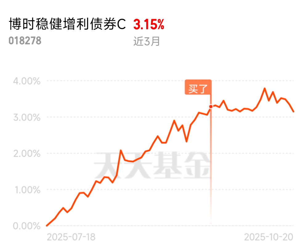 $博时稳健增利债券C$ 近三个月已有3.15% 的收益到手,比存银行一年的收益还多出一大截,持有体验还特别稳。近期货币政策预期宽松,央行三季度例会强调“落实落细”适度宽松政策,比之前更注重执行细节,市场都在等四季度降息。对债基来说,降息直接利好债券估值,现有债券的票息比新发行的高,价格就会上涨,基金持有的债券组合能获得估值收益。而且基金经理调仓能力强,能提前布局利率债、高等级信用债,以便及时抓住降息带来的机会。这只基金权益仓的抗跌性更是超出预期,基金没去碰那些炒得火热的题材股,反而重仓中低估值的红利风格和内需消费,还加了底部预期改善的周期股。最近A股冲高回落,科技板块回调严重,但这些板块要么有稳定分红,要么有基本面支撑,跌幅特别小,反而帮组合稳住了净值。之前看有的不少基金因为权益仓激进,一天跌好几个点,对比之下更凸显了这基权益配置的“稳准狠”。当下货币政策利好还没兑现,债市行情能延续,趁着这波回调我果断加了一笔,份额多攒些,过年能有个好收成!#宁德时代Q3净利润185.5亿元!如何解读?#