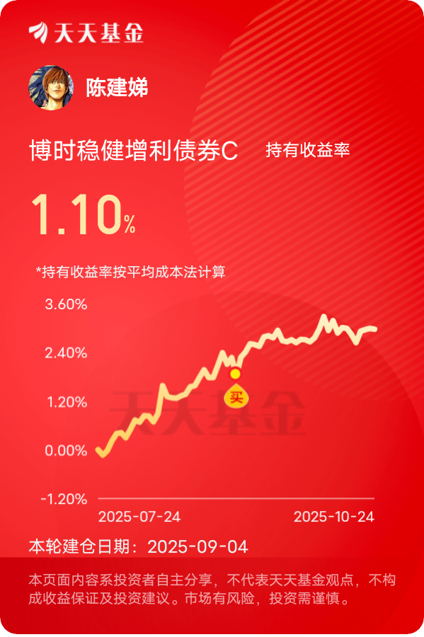 现阶段债市横盘震荡,但$博时稳健增利债券C$ 一直延续它“稳中有进”的风格,近一周稳定产蛋两位数,三个月下来涨幅直逼3%,近一年累计收蛋877个,持续收益能力十分出色。10月以来最明显的感觉就是,机构开始抢配债券了。四季度本来就是布局明年资产的窗口期,银行理财、社保基金这些大机构都面临资产荒,债市调整后收益率上去了,配置性价比一下就凸显出来。基金经理调仓很灵活,能及时跟上机构的配置节奏,最近净值上升速度明显比同类快不少。再加上它的权益仓,虽然占比不高,但走的是稳健路线,全是宏创控股、洛阳钼业这种周期龙头,估值低、抗跌性强。最近大宗商品价格企稳回升,这些股票不仅没拖后腿,反而涨了不少,让基金在债券基础上又多赚了一笔。这基流动性强的优势在当下行情里更凸显,想落袋为安随时能赎,持有超过7天还免赎回费。现在中美经贸摩擦又有不确定性,避险资金都往债市涌,这只基既有债券打底,又有权益增强,简直是震荡市的宝藏基!#A股逼近4000点!半日成交1.5万亿# #晒收益#