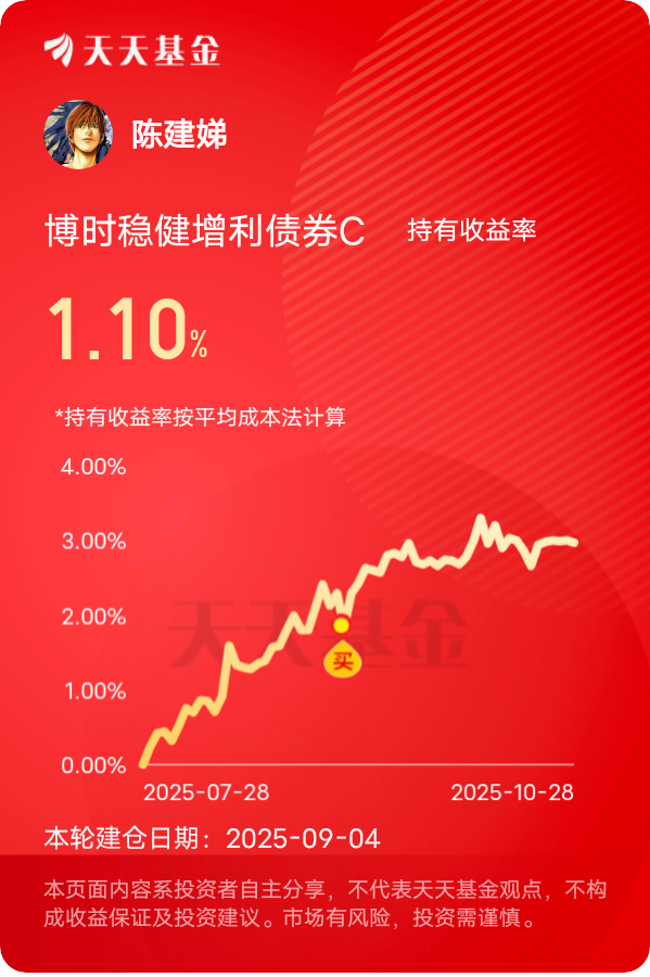 固收+策略很契合当前市场,$博时稳健增利债券C$ 债券做底仓稳得住,少量权益增强收益,股债两边机会都能抓着。近三个月累积收益2.97%,半年稳稳攒了645个蛋。本来看中的是这只基金的收益能力,没想到它的稳定性也非常强,一年最大回撤仅0.68%。10月26日国务院的金融工作报告里提到,要建立融资平台化债的政策框架,还及时提供应急流动性借款,现在融资平台债务风险明显缓释了。这只基金的信用债持仓里,有不少高等级城投债,现在政策兜底,这些债券的票息收益更稳了。更惊喜的是这只基金的权益配置,虽然比例不高,但踩点很准。三季度科技板块涨得好的时候,它配了些高端装备领域的个股,赚了波超额收益;最近市场震荡,又悄悄换成了红利风格的股票,刚好契合了“红利风格性价比抬升”的判断。这灵活又精准的调整能力,让这基的净值一路走高。而且这基没有申购费,持有超过7天还免赎回费,既适合短期波段,也能长期拿着赚收益。#慢慢投基路 你悟出了哪些投资哲学?# #晒收益#