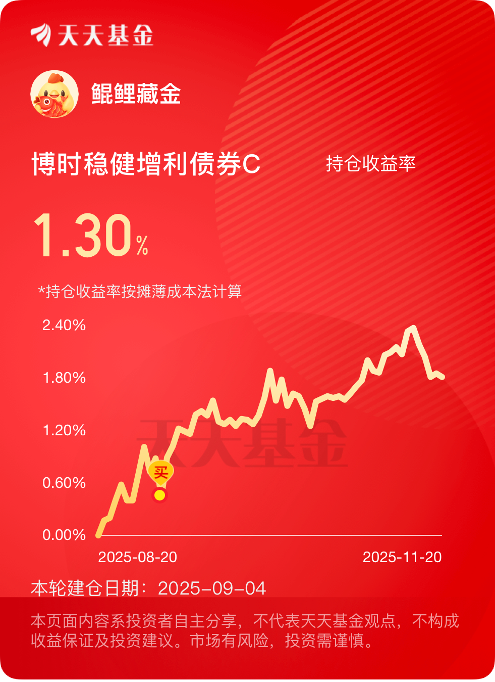 在当下市场环境中,债打底,股增强的固收+优势凸显,以$博时稳健增利债券C$为例,近三个月收蛋181个,半年累计攒蛋560多,其收益排名长期处在同类前列,实力在线。近期央行买断式逆回购持续放量,11月3个月和6个月期限的投放规模达到5千亿,存量规模冲到6.3万亿新高。这种操作能给银行体系注入大量中期流动性,保持资金面宽松,这基的债券仓位里,短久期信用债占比很高,正好受益于短端利率下行,最近同业存单利率处于高配置价值区间,年末还有超预期下行可能,债券部分的票息收益越来越稳。而且这基流动性充足,持有起来特别安心。其权益部分的表现更是超出预期!基金经理选股特别精准,华友钴业作为新能源产业链上游龙头,受益于动力电池需求回暖以及钴、镍等原材料价格上涨,业绩预期持续改善,而新能源板块经过前期调整,现在估值处于合理区间,后续上涨空间很大。还有铜陵有色,作为有色金属龙头,随着全球经济复苏预期升温,大宗商品价格稳步上涨,公司业绩有望持续改善,最近股价也在逐步修复。这基选择了顺周期的资源类板块,既控制了风险,又抓住了结构性机会。现在股市波动加剧,想灵活调整仓位又不想承担高风险,博时稳健增利这债多股少的配置再合适不过了。##观点搭子团火热招募中!#