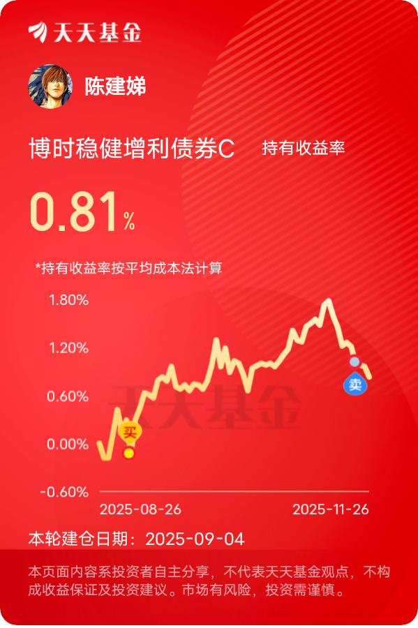 当市场分歧加大,均衡的资产配置显得尤为重要。$博时稳健增利债券C$ 的策略是以债券作为主要持仓确保基础收益,同时以部分权益仓位争取增强收益。这主债辅股的结构效果明显,近六月收益率已有5.37%。近期央行恢复了年初暂停的公开市场国债买卖操作,10月底净投放200亿元,信号意义极强,这无疑给债市吃了颗定心丸。专家都说,这次重启操作是货币政策与财政政策协同发力的体现,重点利好中长久期利率债,博时稳健增利早就提前布局,债券组合中长久期利率债占比不低,刚好精准受益于这波政策红利。它的权益仓位更是独到眼光,没有追热门的科技股,反而聚焦消费复苏和估值洼地板块,前十大重仓股里的海信视像太亮眼了!近期促消费政策持续发力,家电板块迎来复苏,海信视像作为家电龙头,不仅估值低,还在智能电视、激光电视领域有技术优势,三季度以来股价大涨,直接为基金贡献了不少弹性收益。同时还配置了新奥能源这种公用事业龙头,业绩稳定、分红可观,在股市震荡时能起到很好的防御作用。这“消费进攻+公用事业防御”的权益组合,既能抓住消费复苏的政策红利,又能控制风险,完美契合当前的市场环境,现在逢低布局正是好时机。#六部门印发促消费新方案!你看好哪个方向?# #晒收益#