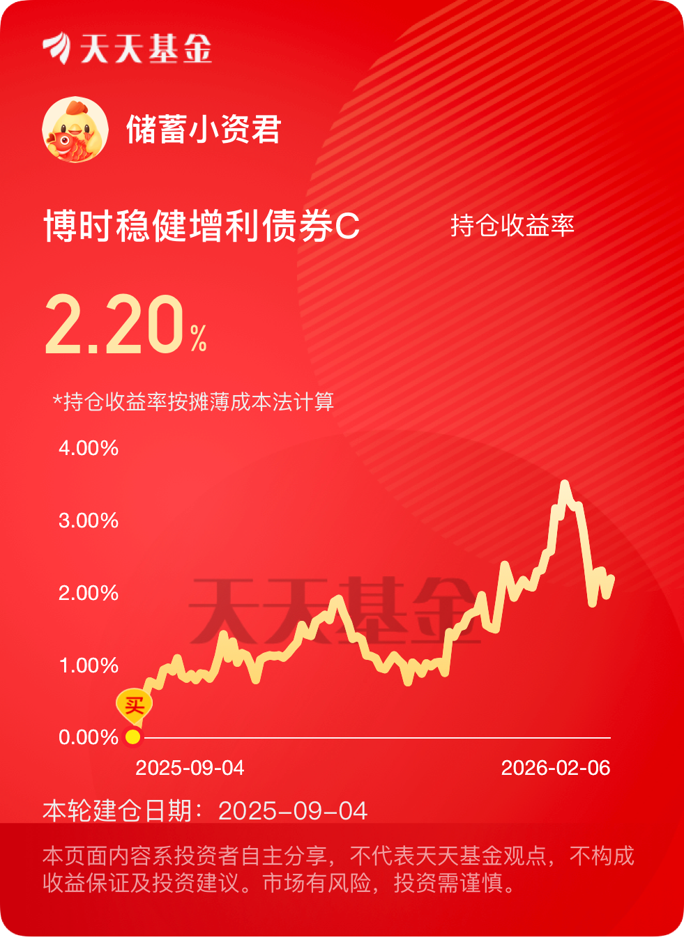 市场给力,$博时稳健增利债券C$ 立马给惊喜!这波债市不错,股市也有看点,这基机会抓得准,稳稳拿下20多个蛋,近一年超8%的收益,业绩过硬。2026年以来债市回暖趋势明显,央行持续呵护流动性,跨节资金无忧。2月10日,财政部、央行还会开展1500亿元1个月期国库现金定存招标,进一步补充银行间流动性,这意味着市场上的资金会越来越充裕,短端利率会维持低位,而这只基金的债券部分主要配置中短久期债券,刚好能最大化享受这份利好,稳步赚取利息收益,不用承受长端利率波动的风险。加上化债专项债加速发行,而且是靠前发力,这会让城投债、地方债的估值修复,而这基的相关债券既能享受化债带来的收益,又能规避信用风险,简直是双赢。而且它的权益仓布局了铜陵有色、藏格矿业、盐湖股份这几只有色股,踩中了最近有色板块的回暖行情,最近全球大宗商品价格回暖,有色板块整体景气度提升,铜陵有色作为铜行业龙头,藏格矿业、盐湖股份作为锂资源龙头,后续上涨空间很大。而且这几只股票在基金净值中的占比不算高,既能贡献超额收益,又不会增加太多风险,这配置相当聪明,既不影响基金的稳健性,又能抓住热点赚差价。#暖阳创作计划#