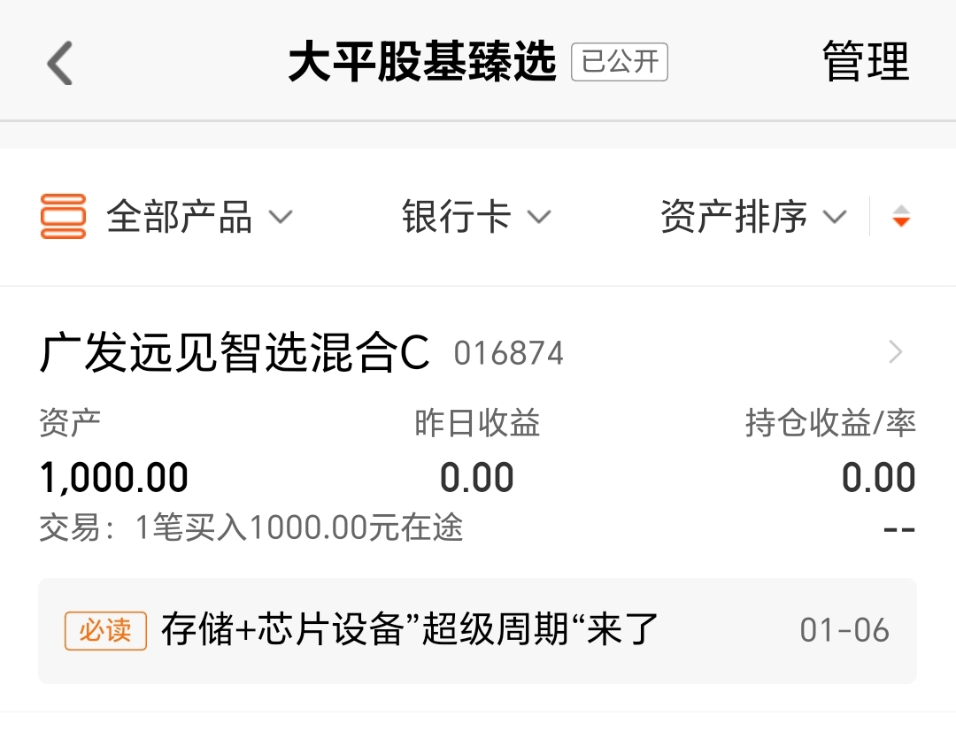今天我买入$广发远见智选混合C(OTCFUND|016874)$1000块钱。