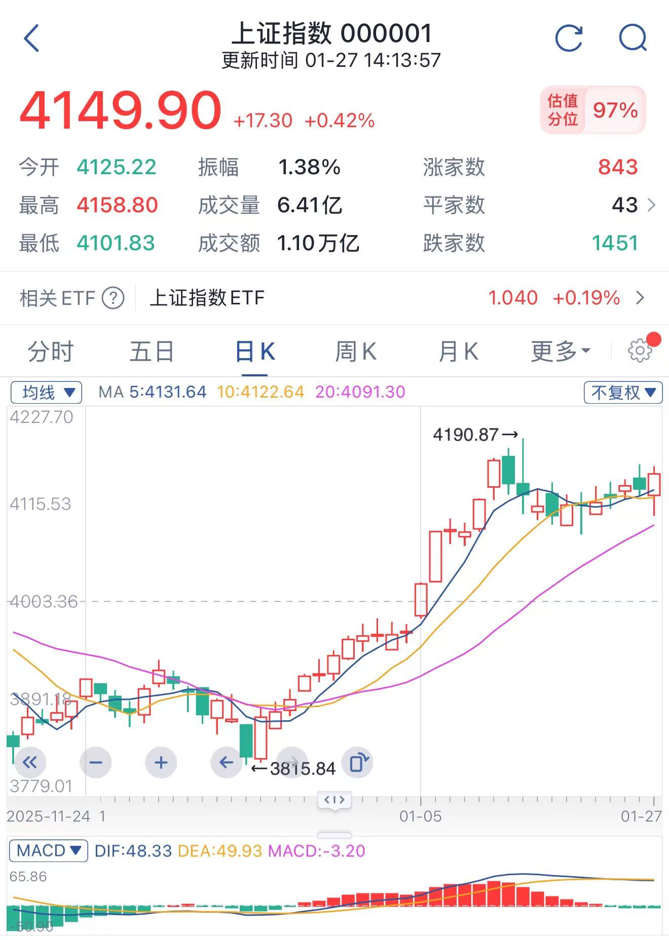 今天A股盘中一直微弱震荡,午后拉升起来了,目前还是保持在4150点附近,两市预计成交2.9w亿,较昨天缩量3700亿,上涨近2000支个股,49家涨停,赚钱效应一般,贵金属、半导体、CPO、保险等领涨市场!话不多说,关注小元,带你抓住行情机会,把握住这波吃肉的机会。