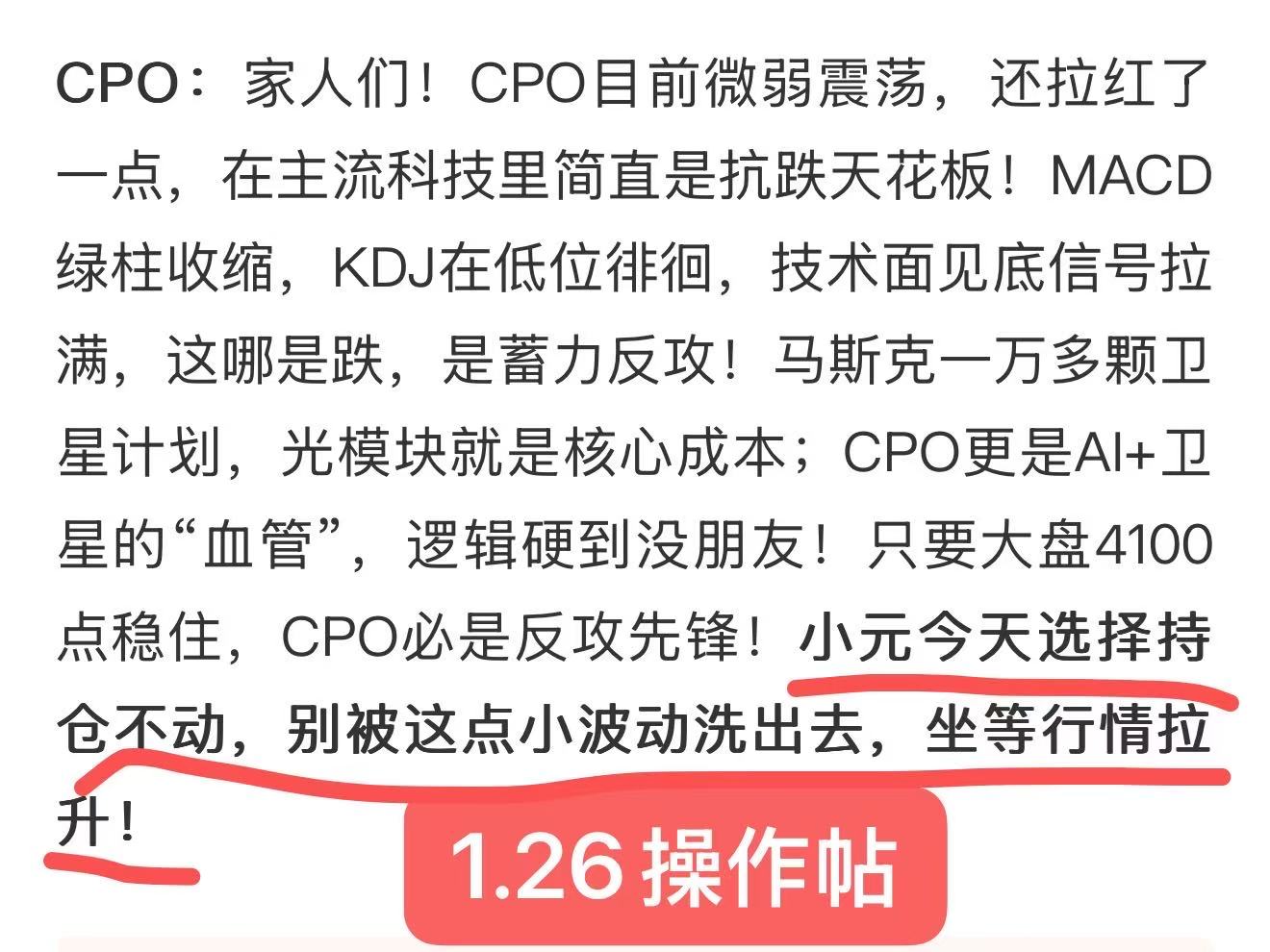 CPO:大盘大跌两天又怎样?CPO逆势连涨!小元预判直接封神!周六小元放话这周验证实力,这波直接预判封神了!周一大盘哐哐大跌,咱点名的CPO直接逆势起飞,今天市场接着跳水,CPO依旧硬刚涨不停!这眼光这格局,谁看了不喊一句牛!这逆势吃肉的快乐,谁懂啊!小元今天暂时没有操作,坐稳扶好,继续周线看涨趋势!