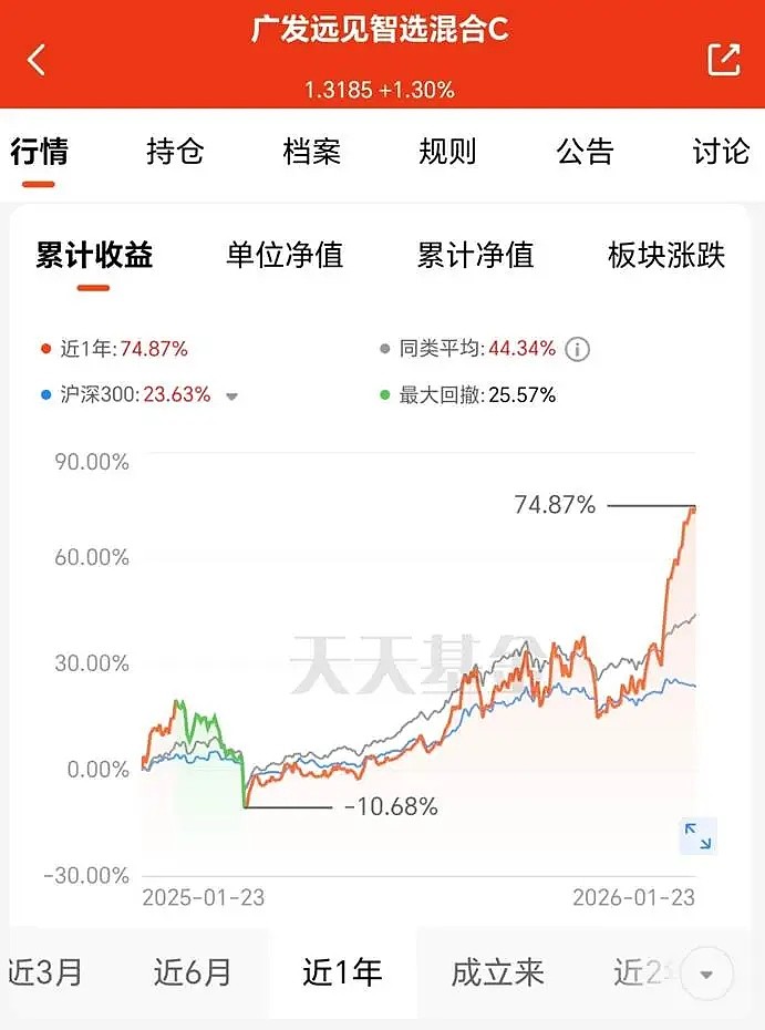 首先关注到的是广发远见智选C(016874),这只聚焦存储产业链的基金,近期业绩表现格外亮眼。从过去几个月的涨幅曲线看,尤其是2026年开年以来,收益排名直冲主动权益基金前列,是新年开门红中极有锐度的产品之一。