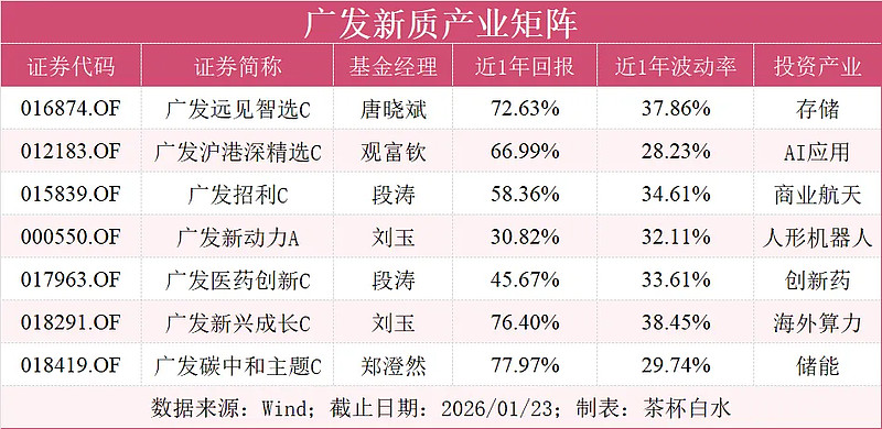 我在开年主动权益基金一周收益榜单中注意到广发基金的几只产品表现不错,结合四季报持仓发现,他们在组合中重点布局的正是AI全产业链、商业航天、创新药等新质生产力的产业方向,且近1年业绩锐度较高。
