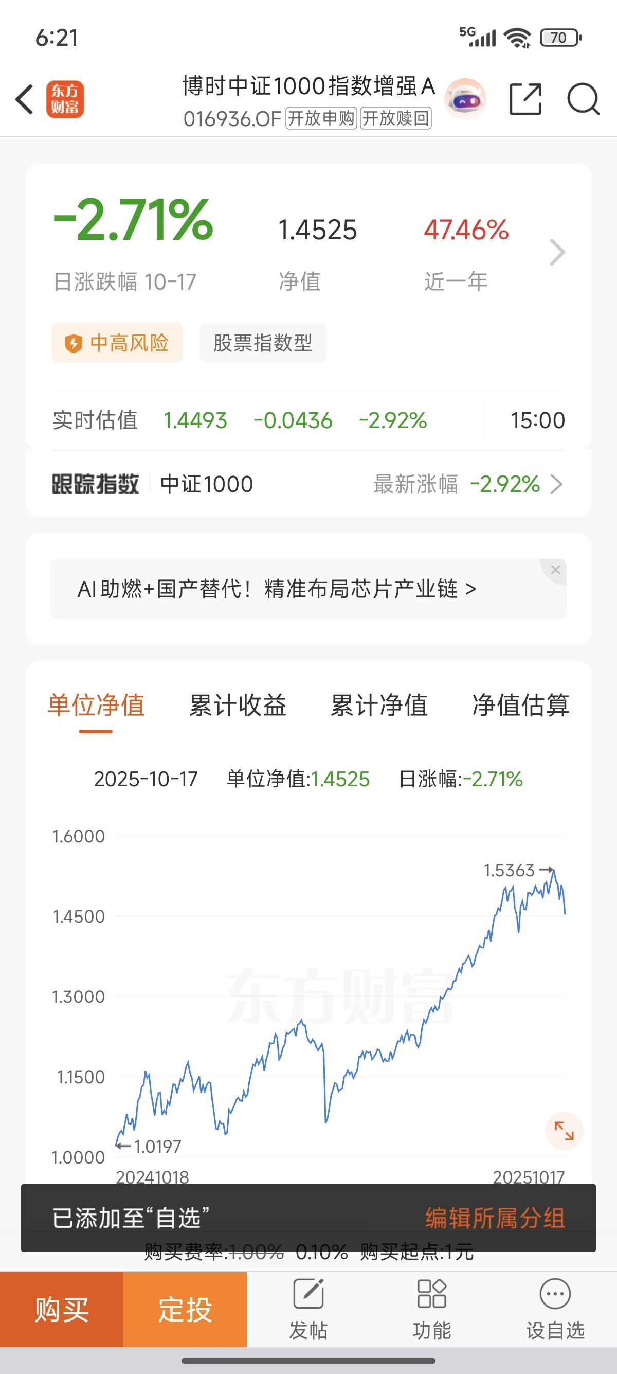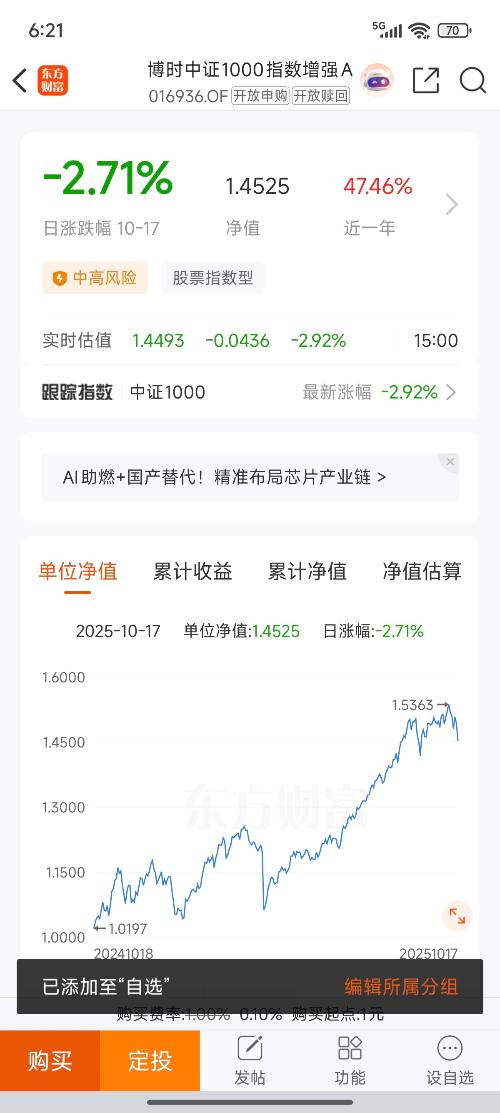 博时中证1000指数增强C:中小盘赛道的弹性之选——在震荡市中捕捉成长的诗行一、策略内核:量化增强驱动超额收益博时中证1000指数增强C(016937)以多因子量化模型为核心,通过价值、成长、动量等因子筛选潜力股,在跟踪中证1000指数的基础上,近一年超额收益达41.93%,显著跑赢基准。基金经理桂征辉团队运用AI算法优化组合,近三年年化收益率16.92%,最大回撤仅-15.34%,展现出较强的风控能力。数据亮点:收益表现:2024年四季度净值涨幅7.47%,近一年收益率34.64%(同类排名前20%);规模增长:2024年四季度规模环比增长11.02%,机构持仓占比22.59%,反映专业投资者认可;行业布局:重仓通信(1.44%)、电力设备(1.4%)等专精特新赛道,分散风险的同时捕捉政策红利。二、市场逻辑:中小盘修复的韧性之盾中证1000覆盖31个行业的中小市值企业,2025年二季度制造业持仓占比67.7%,与政策导向的“新质生产力”高度契合。历史数据显示,市场急跌后中小盘弹性更强:2024年9月政策利好后,中证1000指数三个月反弹28.45%,超额基准35.82%。当前优势:估值修复空间:当前市盈率分位35%,低于历史中枢,机构预测2025年盈利增速25%;流动性改善:基金股票仓位93.87%,现金占比7.02%,灵活应对市场波动;政策催化:专精特新企业研发费用加计扣除比例提升,半导体、AI等细分领域直接受益。三、配置价值:攻守兼备的长期选择防御性:中小盘股与大盘相关性较低,2024年最大回撤-18.86%,低于沪深300的-23.5%;进攻性:量化模型捕捉短期交易机会,近一月跟踪误差4.02%,增强策略有效;长期性:中证1000成分股中70%为高新技术企业,契合经济转型方向,五年年化收益超12%。四、风险提示与策略建议波动风险:中小盘流动性较弱,需关注市场情绪变化;行业集中:制造业占比近七成,需跟踪产业政策与出口数据;操作建议:定投为主,逢低加仓,持有周期建议1年以上。结语博时中证1000指数增强C,如同一位“守正出奇”的诗人,在中小盘的土壤中播种创新的种子。其量化增强策略与政策红利的共振,震荡市中穿越周期