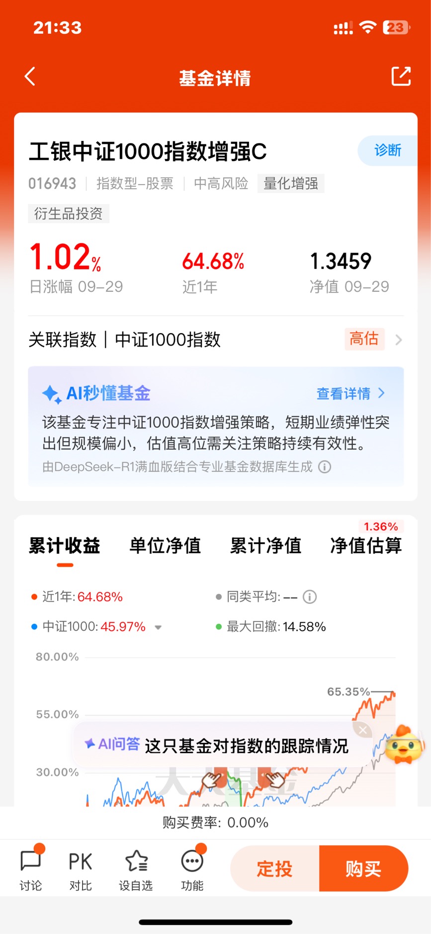 工银中证1000指数增强在这片投资领域中脱颖而出。工银瑞信基金公司量化投资经验丰富,拥有成熟多因子选股框架与严格风险控制体系。在该产品中,量化模型与基本面分析深度结合,从海量数据里精准筛选潜力个股。通过动态行业轮动,基于宏观经济数据与产业趋势及时调整行业权重,把握行业发展脉搏;个股精选优化环节,剔除财务瑕疵标的,增配高盈利质量公司,保障投资组合质量。从业绩表现来看,截至2025年9月,工银中证1000指数增强近一年收益率远超中证1000指数,彰显出卓越的超额收益获取能力。