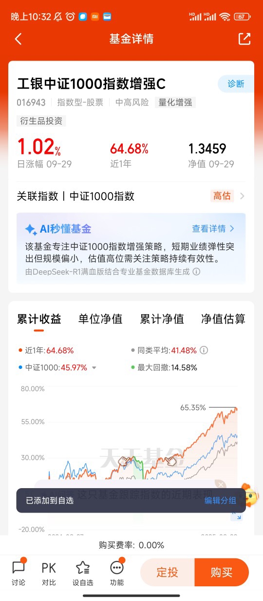 $工银中证1000指数增强C$的“弹性”比大盘股更足,大盘股盘子重,涨起来可能磨磨蹭蹭,一天涨1%都算不错,但小盘成长股只要踩对行业风口,比如碰上技术突破、政策扶持,业绩增速能一下冲上去,股价也可能跟着“蹦跶”,动不动就涨5%、10%。指数增强基金本来就会在指数成分股之外,选一些优质个股加重仓,中小盘股的高弹性,刚好能让这份“增强”效果更明显,大盘指数涨3%,基金可能借着几只中小盘牛股,直接冲到5%以上。