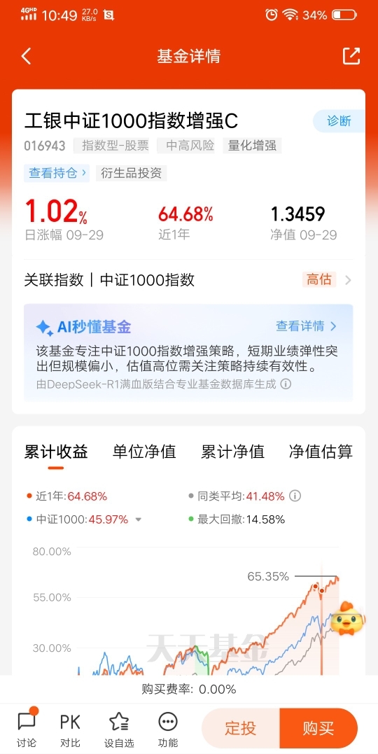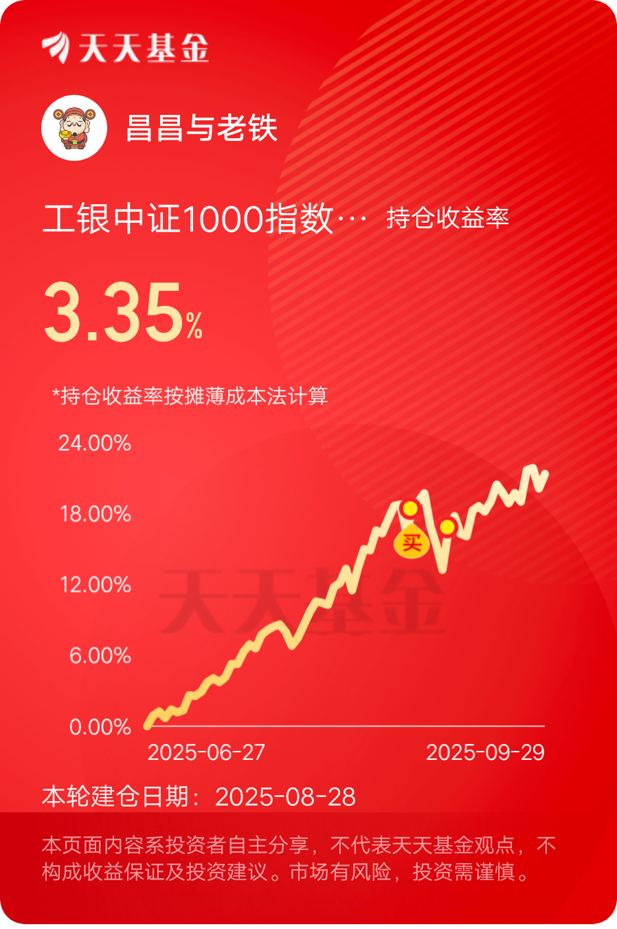 基金近一年64.68%的收益率,大幅跑赢中证1000指数,在市场风格分化的当下,展现出强劲的盈利能力。同时,其在风险控制方面的表现也让人放心。未来,随着政策对实体经济和科技创新的持续支持,小盘成长赛道有望继续保持活力,中证1000指数的增长潜力值得期待,而工银中证1000指数增强C凭借其优秀的管理能力和策略优势,大概率能继续获取超额收益。我会持续持有并关注这款基金,也推荐给有类似投资需求的好友。$工银中证1000指数增强C$