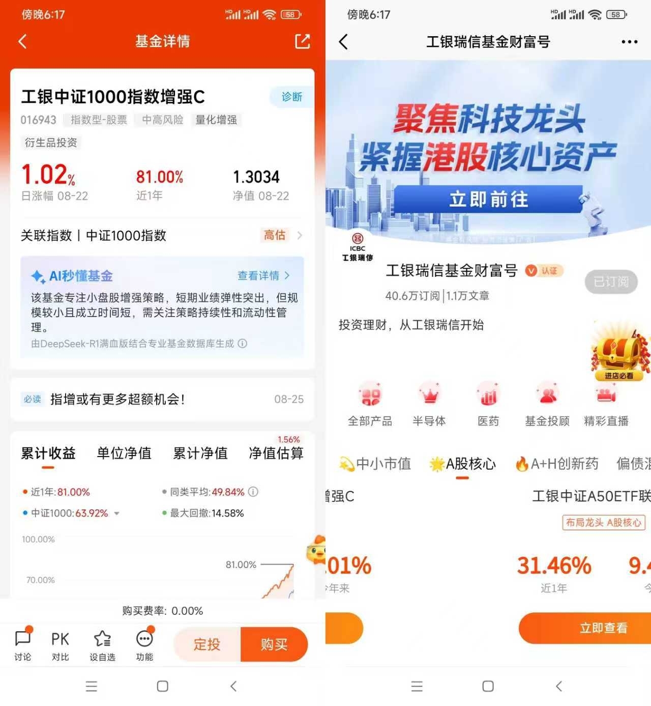 工银瑞信的实力也让人放心,作为大基金公司,投研和风控都有底子。现在政策支持实体和科技,小盘股的成长空间还在,选个靠谱的增强型产品,比自己瞎琢磨强。布局中证1000,我觉得工银这只C类基金确实是个实在选择——不讲故事,只讲收益和低门槛,适合咱们普通投资者慢慢攒钱。