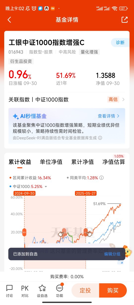 刚上班时跟风买沪深300指数基,今年看着同事晒小盘股收益羡慕到捶桌——直到挖到工银中证1000指数增强C(016943),才算摸清“赚市场钱+赚超额钱”的门道。作为持仓半年的职场萌新,掏心窝子聊聊这只宝藏基的投资价值。
