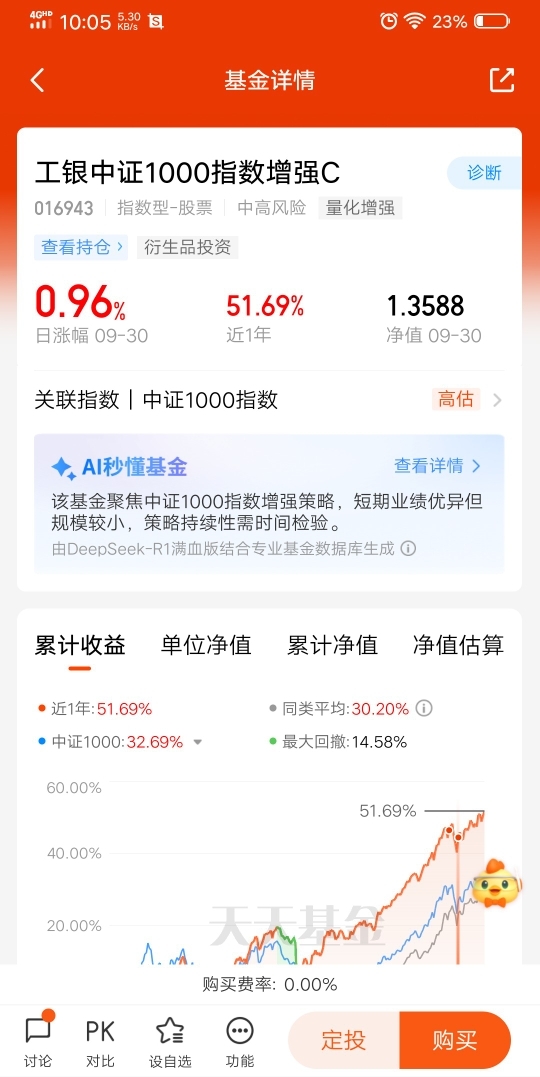 截至2025年9月30日,近一年收益率居然有51.69%,要知道同期中证1000指数收益率才32.69%,超额收益相当突出,这增强效果真的很让人惊喜。后来了解到,它能有这么好的表现,一方面是因为中证1000指数成分股多、机构覆盖度低,存在不少定价偏差的机会,基金经理能靠量化模型和基本面分析挖掘低估股票;另一方面量化策略还能高效处理海量数据,及时捕捉市场机会,同时分散投资降低风险,这两点让我觉得这只基金的“增强”不是空谈,而是有实实在在的逻辑支撑。最后想说,对于想布局小盘股、追求超额收益的投资者来说,工银中证1000指数增强C真的是个值得考虑的优质选择,推荐大家也去深入了解一下!$工银中证1000指数增强C$