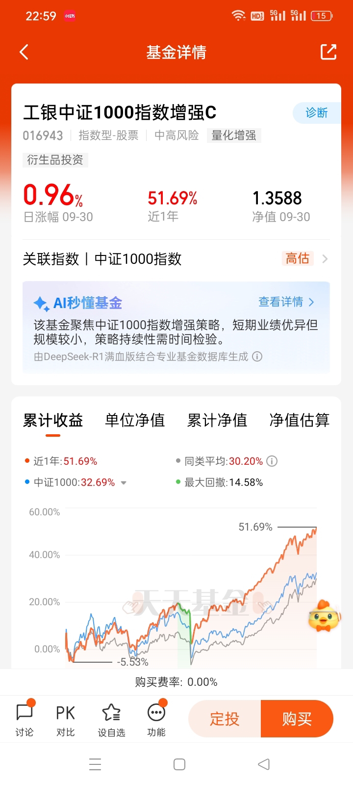 所以指数增强产品通过“被动跟踪+主动优化”的模式,在获取市场平均收益的同时,提供了可持续的超额收益来源。其投资价值在2025年结构性行情中尤为突出:中小盘指数增强凭借高弹性与政策红利,成为布局新经济的理想工具;量化策略的迭代升级与AI赋能,进一步夯实了超额收益的稳定性。我会结合自身风险偏好,优选头部管理人的产品$工银中证1000指数增强C$ ,通过长期持有与动态调整,实现资产的稳健增值。@工银瑞信基金