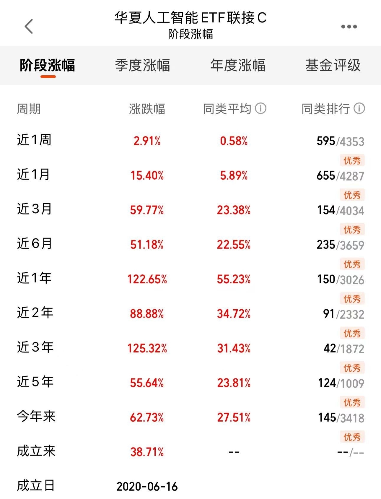 今天估值近3%,昨天单日收涨1.76%突破1年新高,近三个月收益59%+,布局电子,通讯、计算机等赛道龙头$华夏人工智能ETF联接C$布局合理,继续跟上了